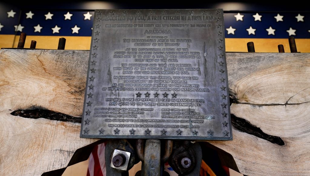 A plaque gives a brief history of Arizona’s replica of the Liberty Bell in the Arizona Traveling Museum during its tour stop on campus in front of Global Credit Union Arena on Feb. 27, 2026. -