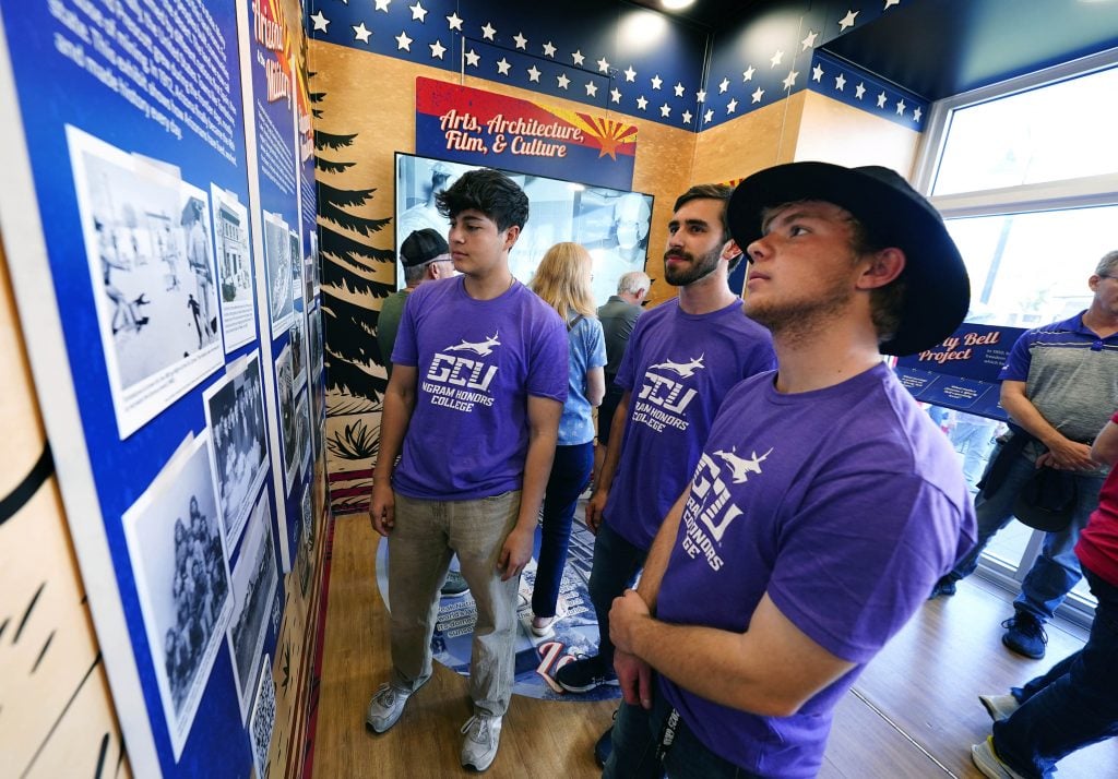 GCU students look over information on Arizona’s history as they tour the Arizona Traveling Museum during its stop on campus in front of Global Credit Union Arena on Feb. 27, 2026. -