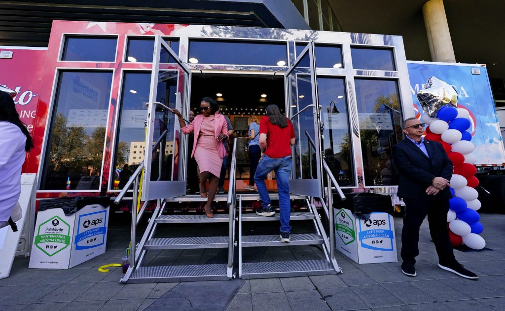 GCU President Brian Mueller, along with Banner Health CEO Amy Perry and Arizona Secretary of State Adrian Fontes, tour the Arizona Traveling Museum during its stop on campus in front of Global Credit Union Arena on Feb. 27, 2026. -