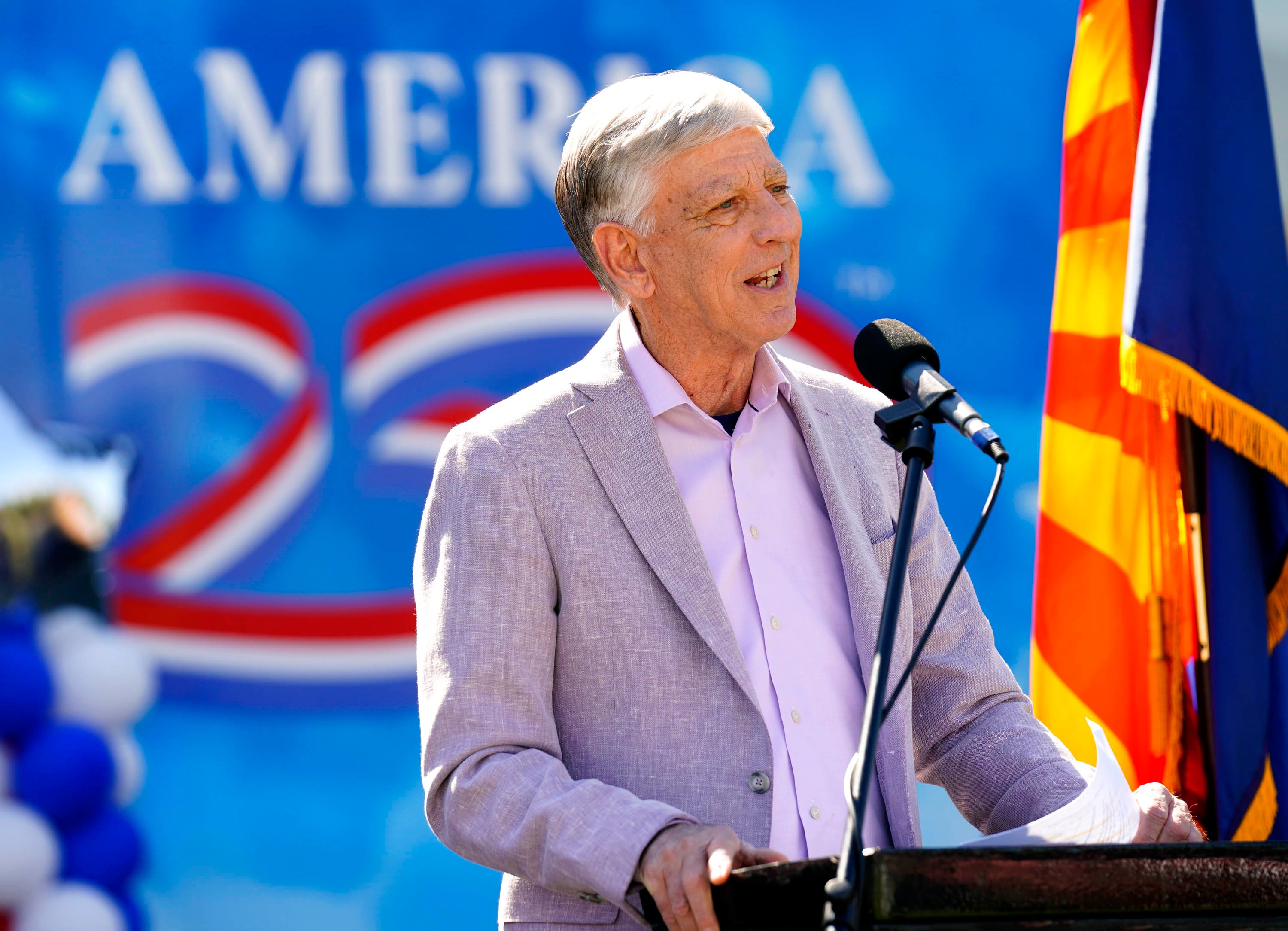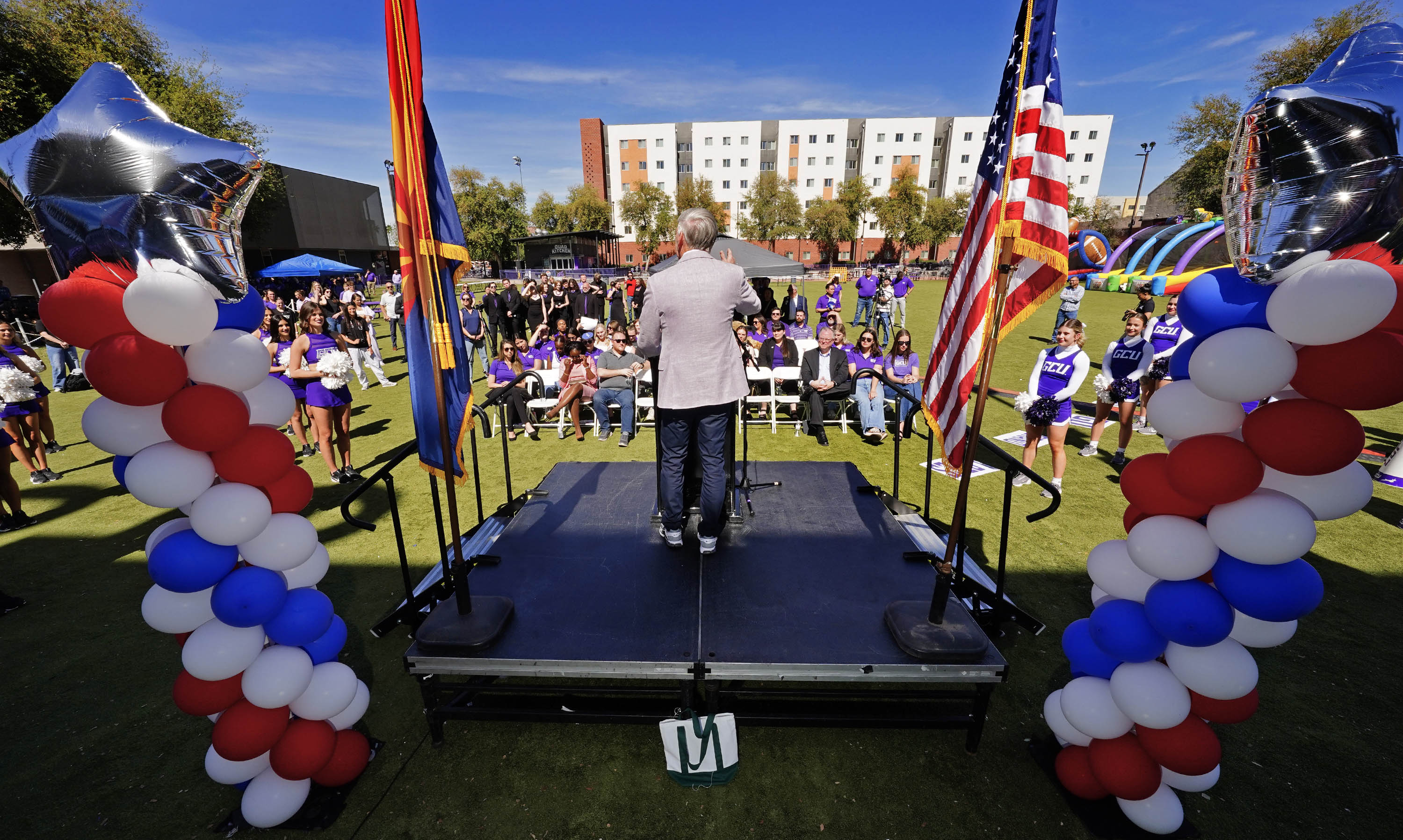 GCU President Brian Mueller welcomes guests to a ceremony celebrating the tour stop of the Arizona America250 Arizona Traveling Museum on campus in front of Global Credit Union Arena on Feb. 27, 2026. -