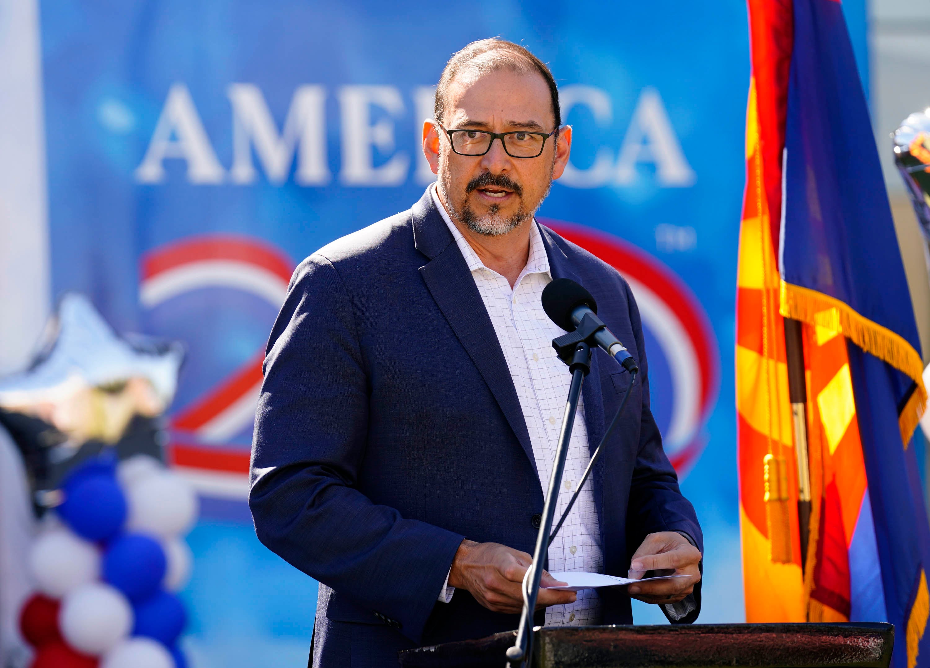 Arizona Secretary of State Adrian Fontes speaks during a ceremony celebrating the tour stop of the Arizona Traveling Museum on campus in front of Global Credit Union Arena on Feb. 27, 2026. -
