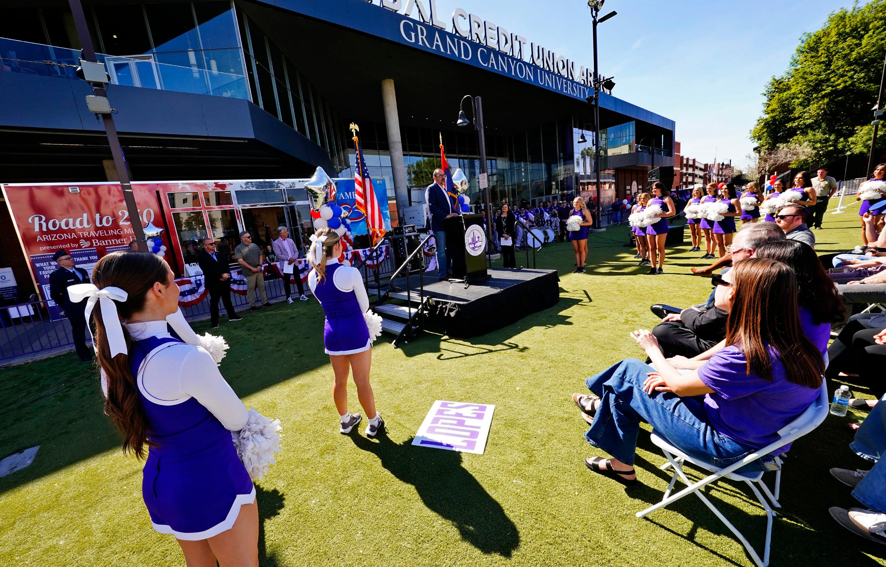 The Arizona America250 Commission brought its Road to 250: Arizona Traveling Museum to Grand Canyon University on Friday. The mobile exhibit, which is making 31 stops in Arizona, features a replica of the Liberty Bell and interactive exhibits on Arizona and U.S. history. A midday ceremony featured guest speakers, GCU officials and GCU's Critical Mass choir, band and cheerleaders. Story