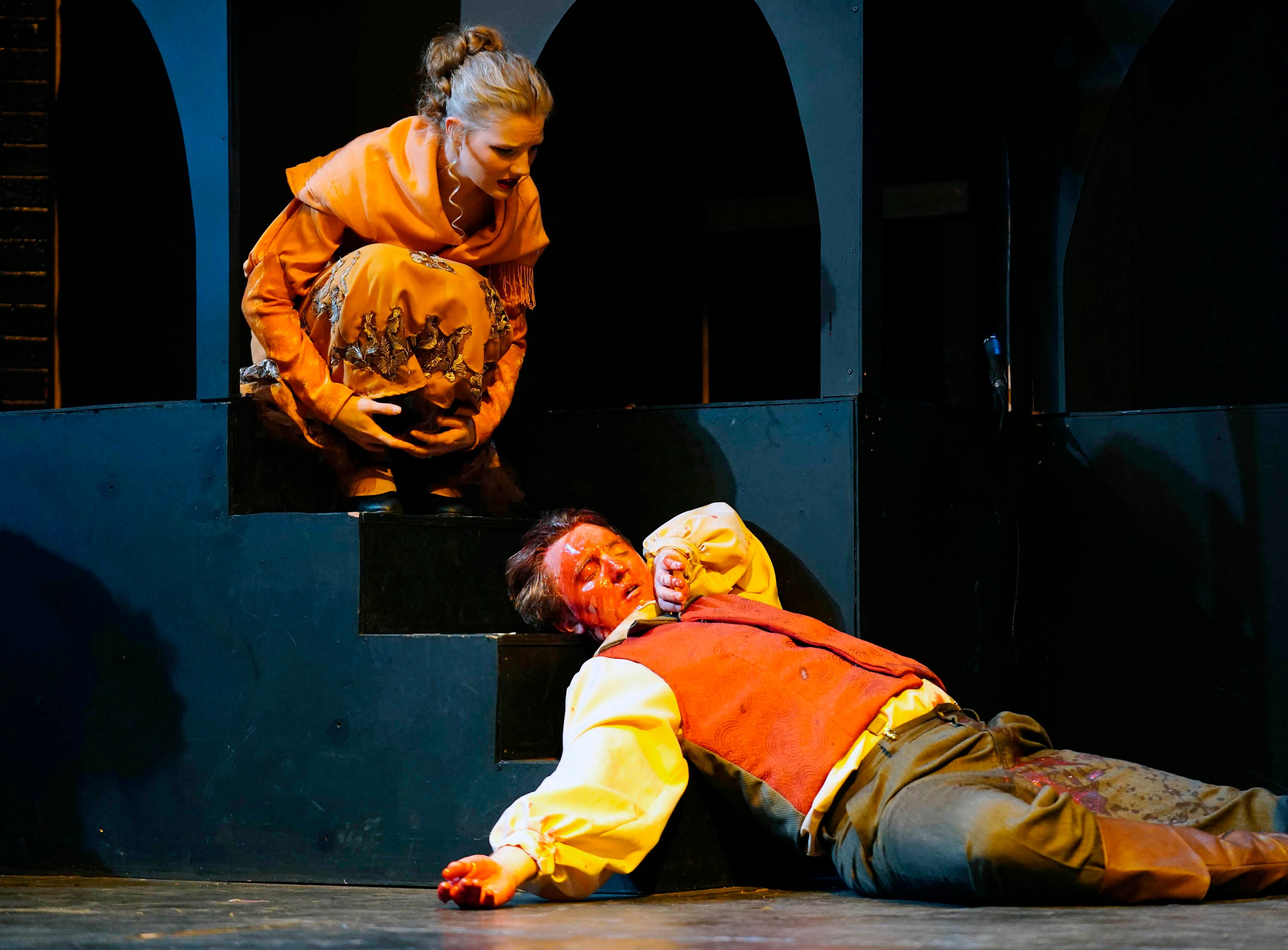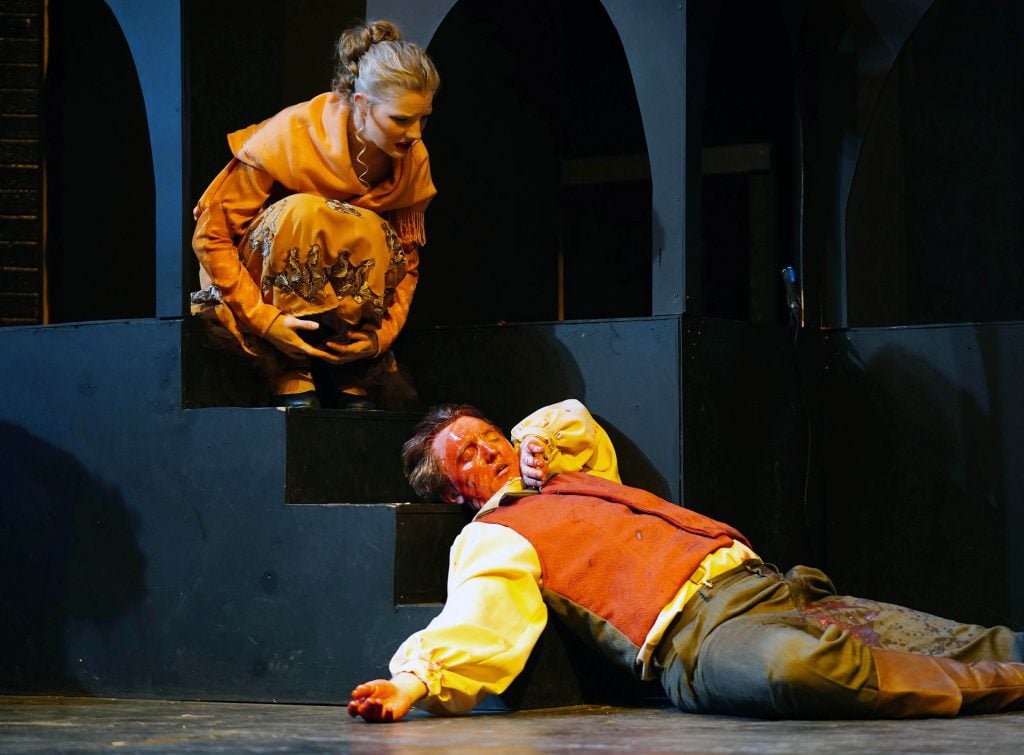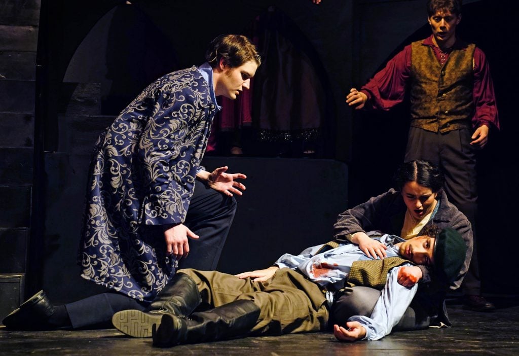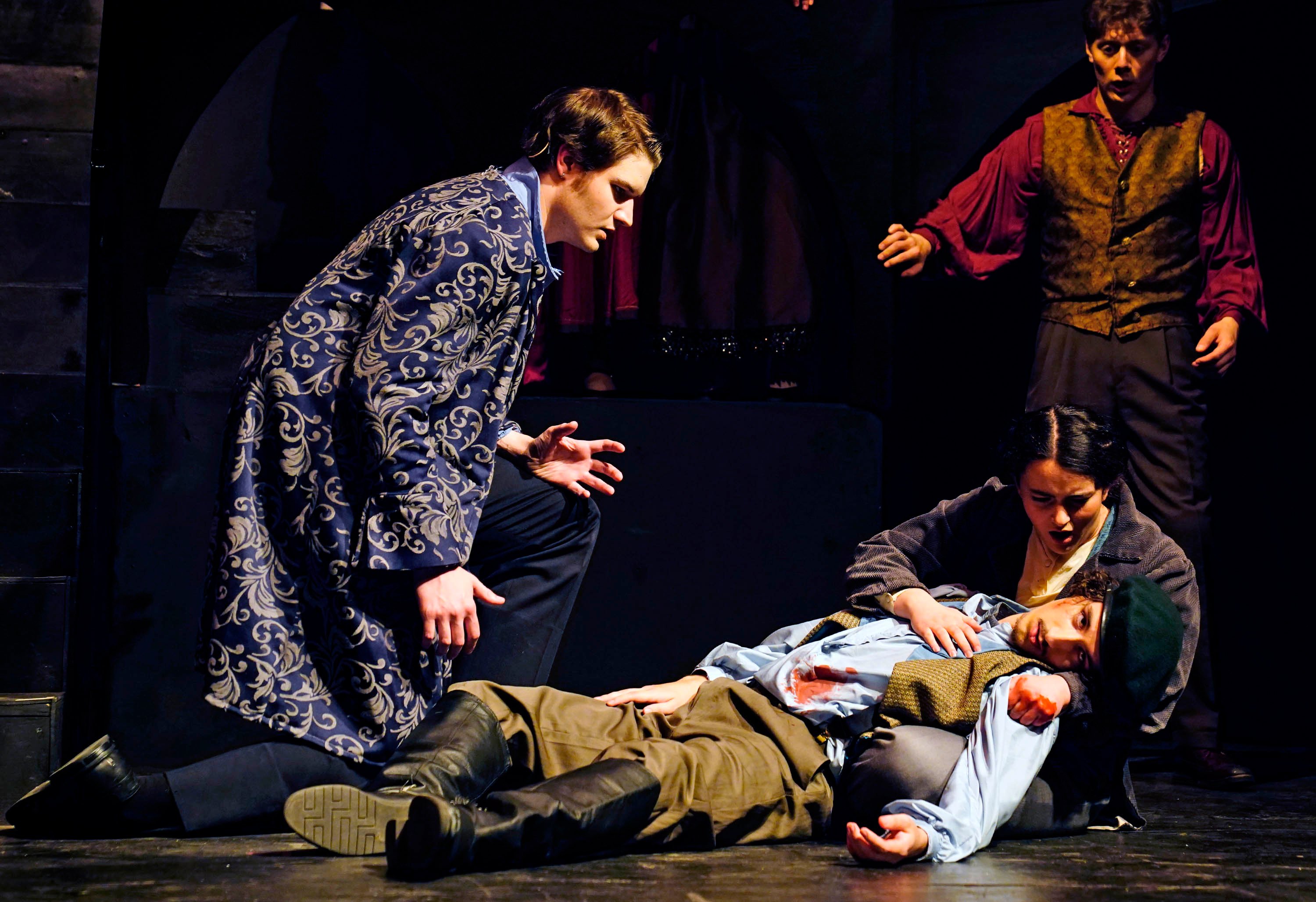 Lady Capulet (Abbie Robertson) looks over a slain Tybalt (Ben Sparling) in the theatre department’s production of “Romeo and Juliet” at Ethington Theatre. -