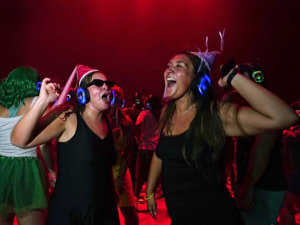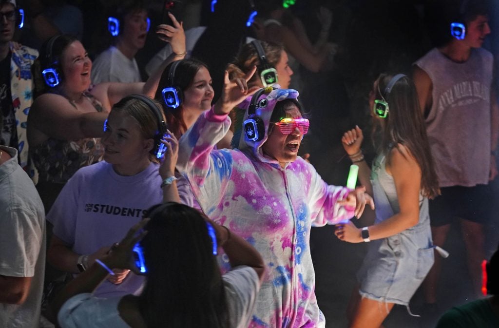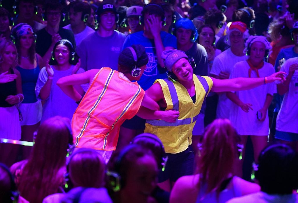 Students dance to the music in their headsets during the Canyon Activities Board-sponsored Silent Disco at Global Credit Union Arena on Aug. 26, 2025. -