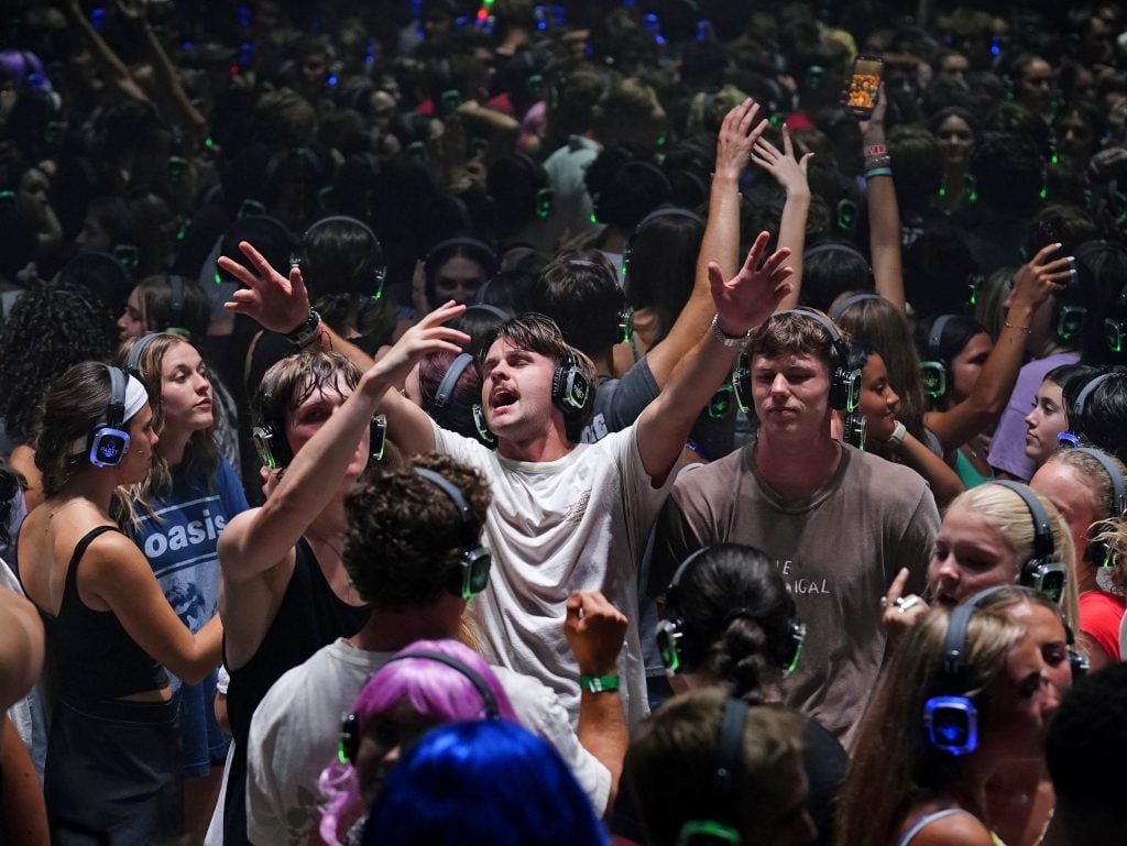 Students listen to music on the green headset channel during the Canyon Activities Board-sponsored Silent Disco at Global Credit Union Arena on Aug. 26, 2025. -