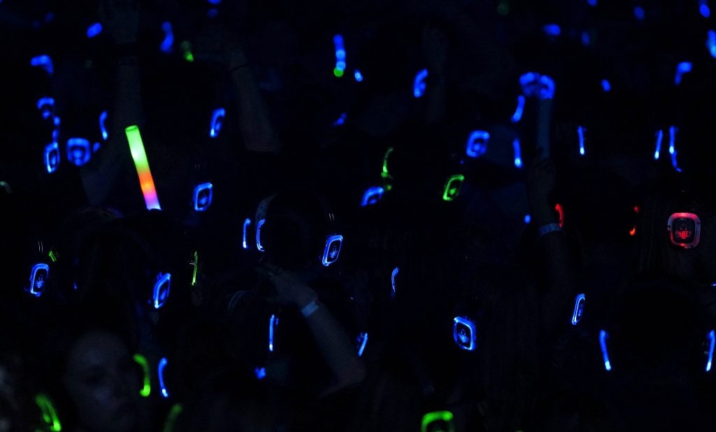 Blue channel headsets illuminate the dark dance floor during the Canyon Activities Board-sponsored Silent Disco at Global Credit Union Arena on Aug. 26, 2025. -