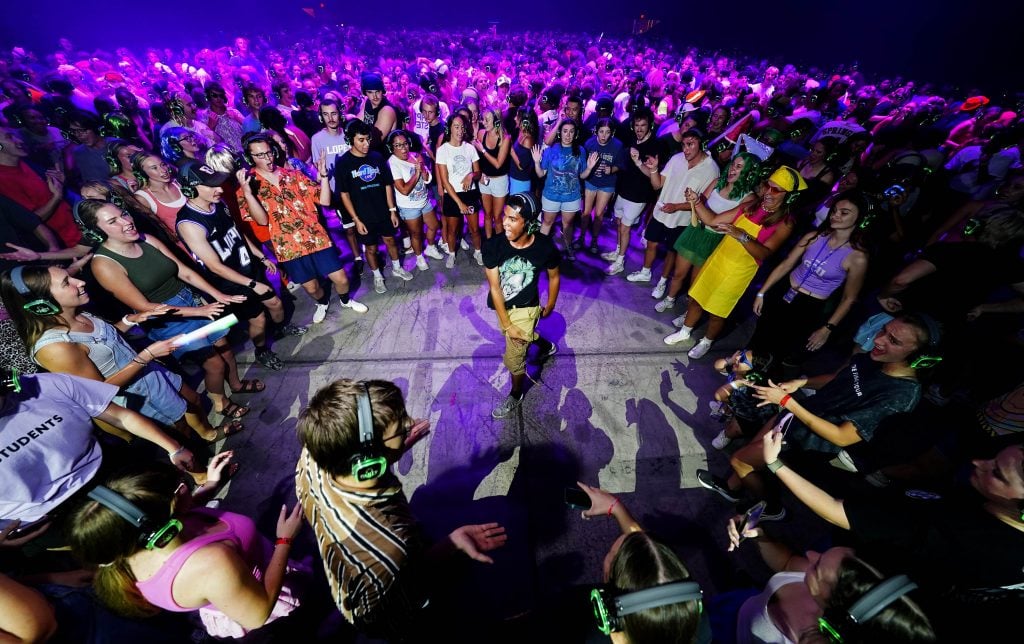 Students sing along to a song as they dance during the Canyon Activities Board-sponsored Silent Disco at Global Credit Union Arena on Aug. 26, 2025. -
