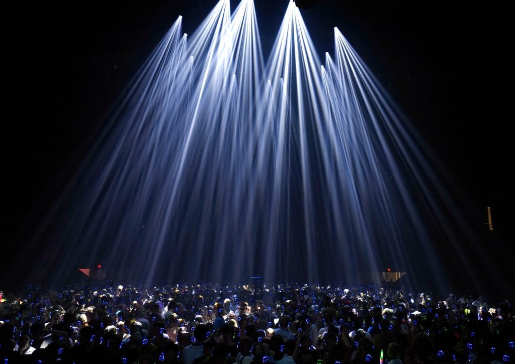 Lights rain down on the dance floor during the Canyon Activities Board-sponsored Silent Disco at Global Credit Union Arena on Aug. 26, 2025. -