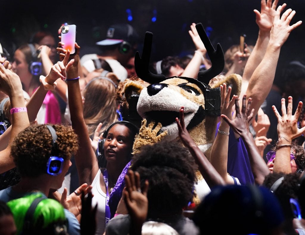 Students flash Lopes-Up as they enjoy the Canyon Activities Board-sponsored Silent Disco at Global Credit Union Arena on Aug. 26, 2025.