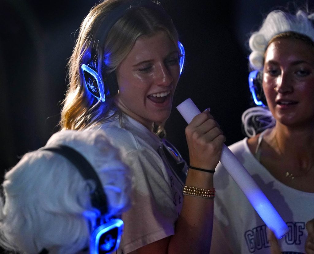 A student sings out to the music in her headset during the Canyon Activities Board-sponsored Silent Disco at Global Credit Union Arena on Aug. 26, 2025. -