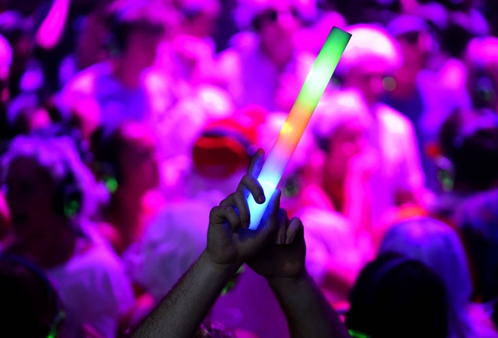 A student with a light stick during the Canyon Activities Board-sponsored Silent Disco at Global Credit Union Arena on Aug. 26, 2025. -
