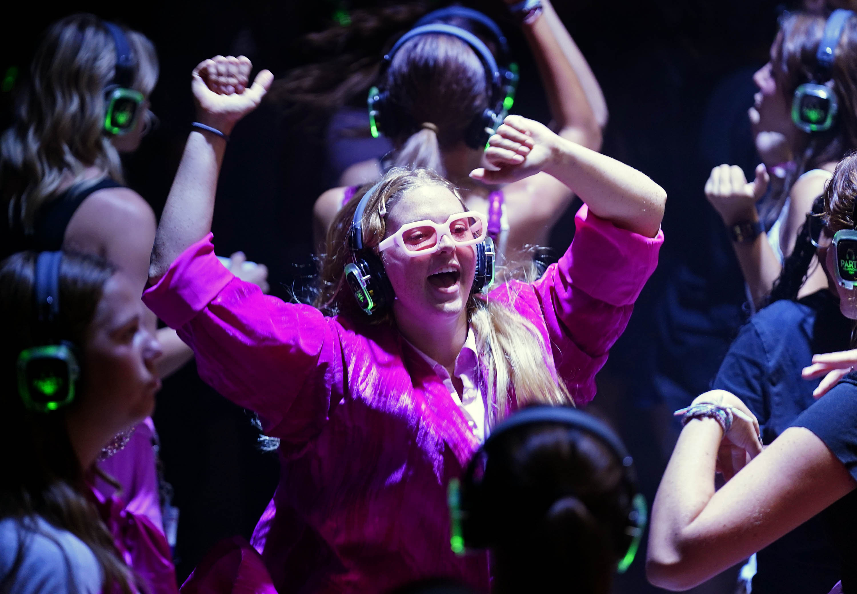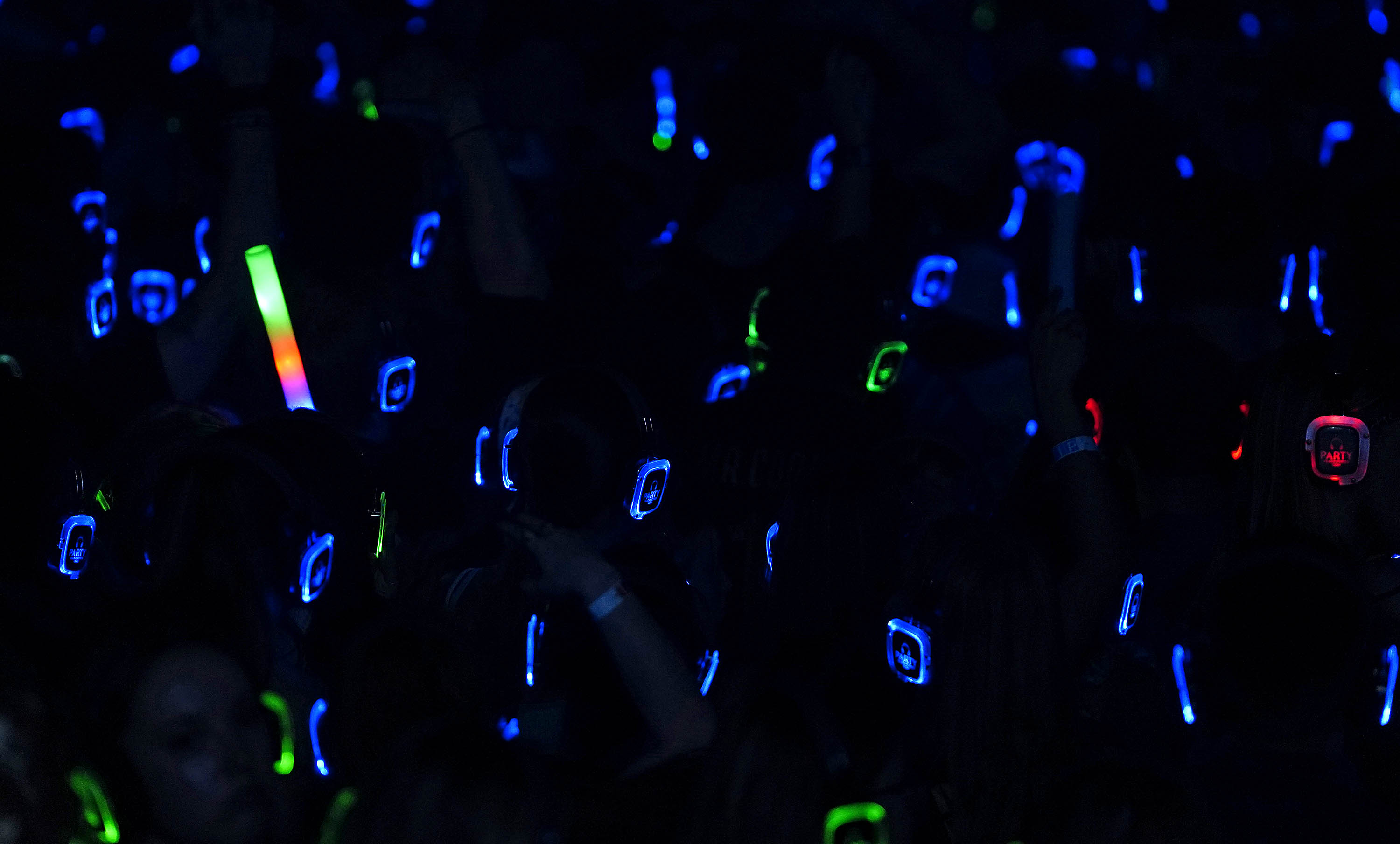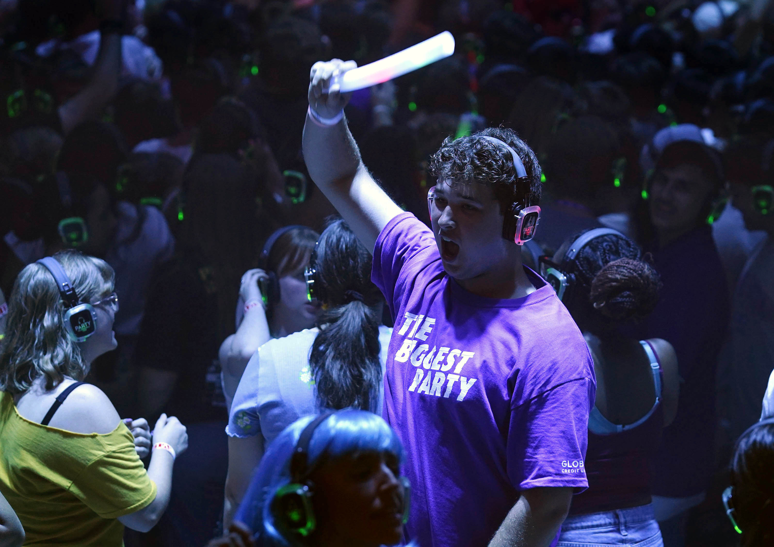 Blue channel headsets illuminate the dark dance floor during the Canyon Activities Board-sponsored Silent Disco at Global Credit Union Arena on Aug. 26, 2025. -