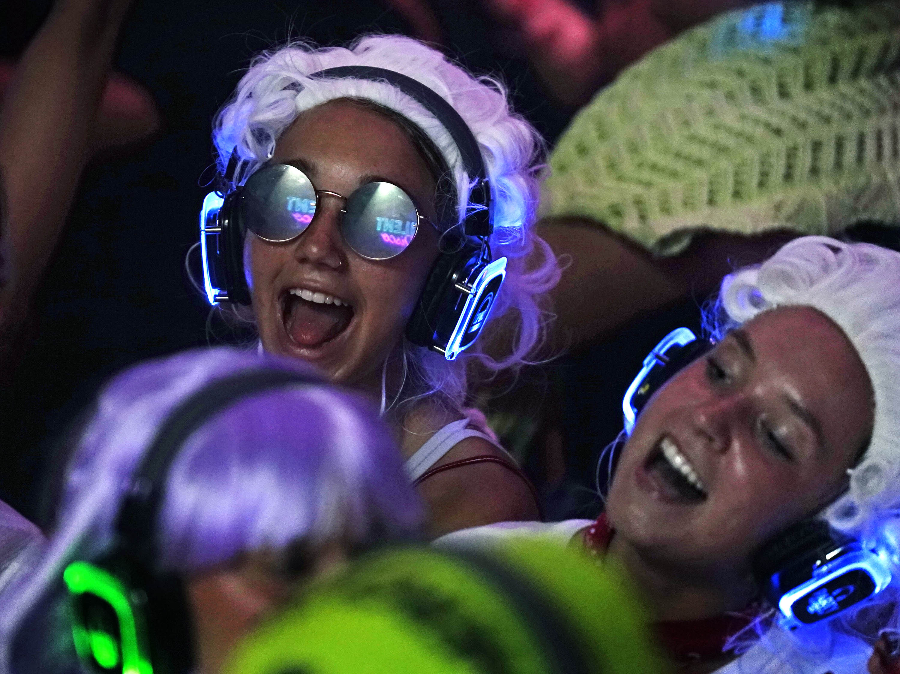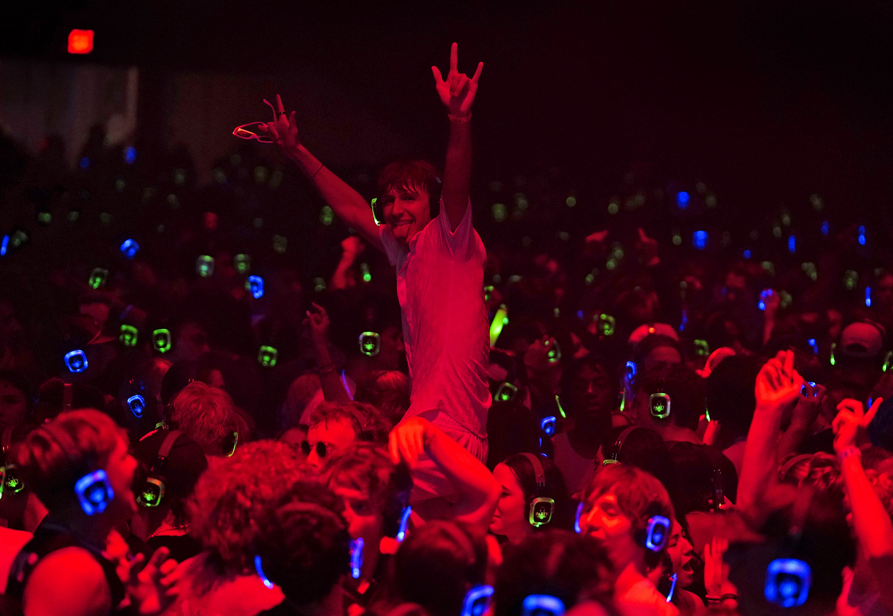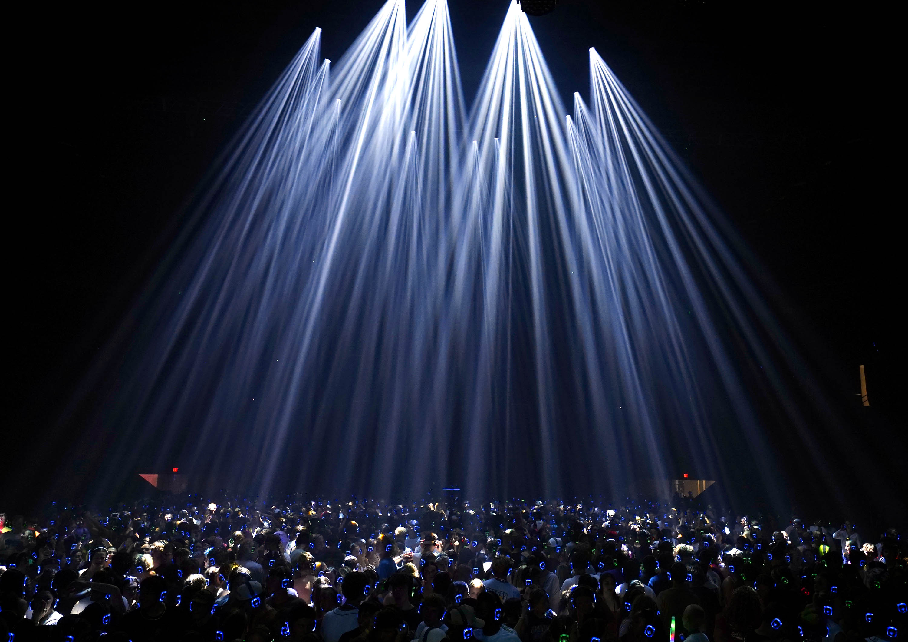 Blue channel headsets illuminate the dark dance floor during the Canyon Activities Board-sponsored Silent Disco at Global Credit Union Arena on Aug. 26, 2025. -