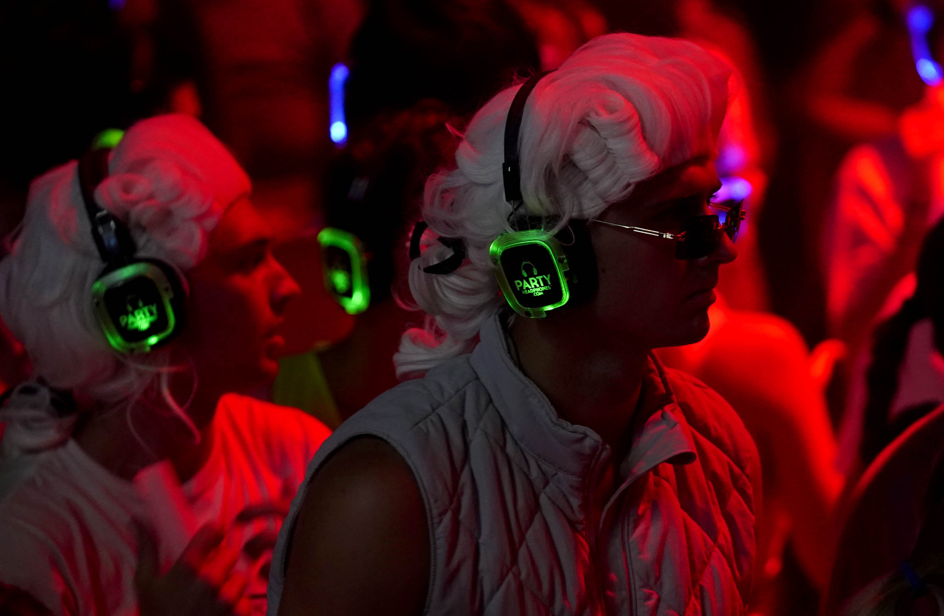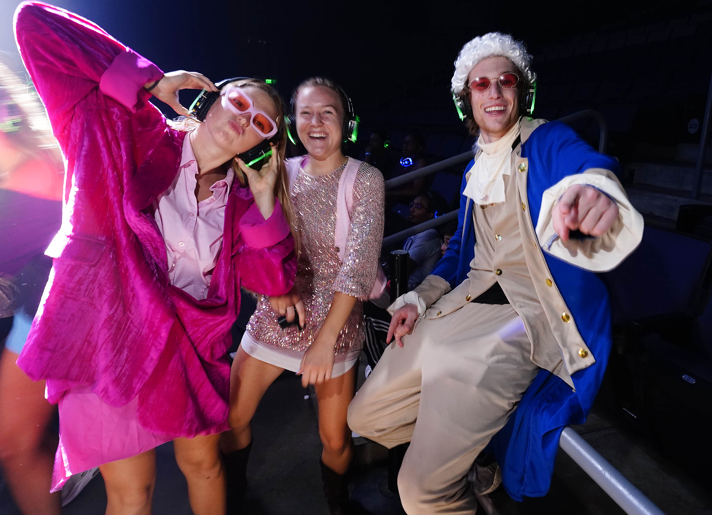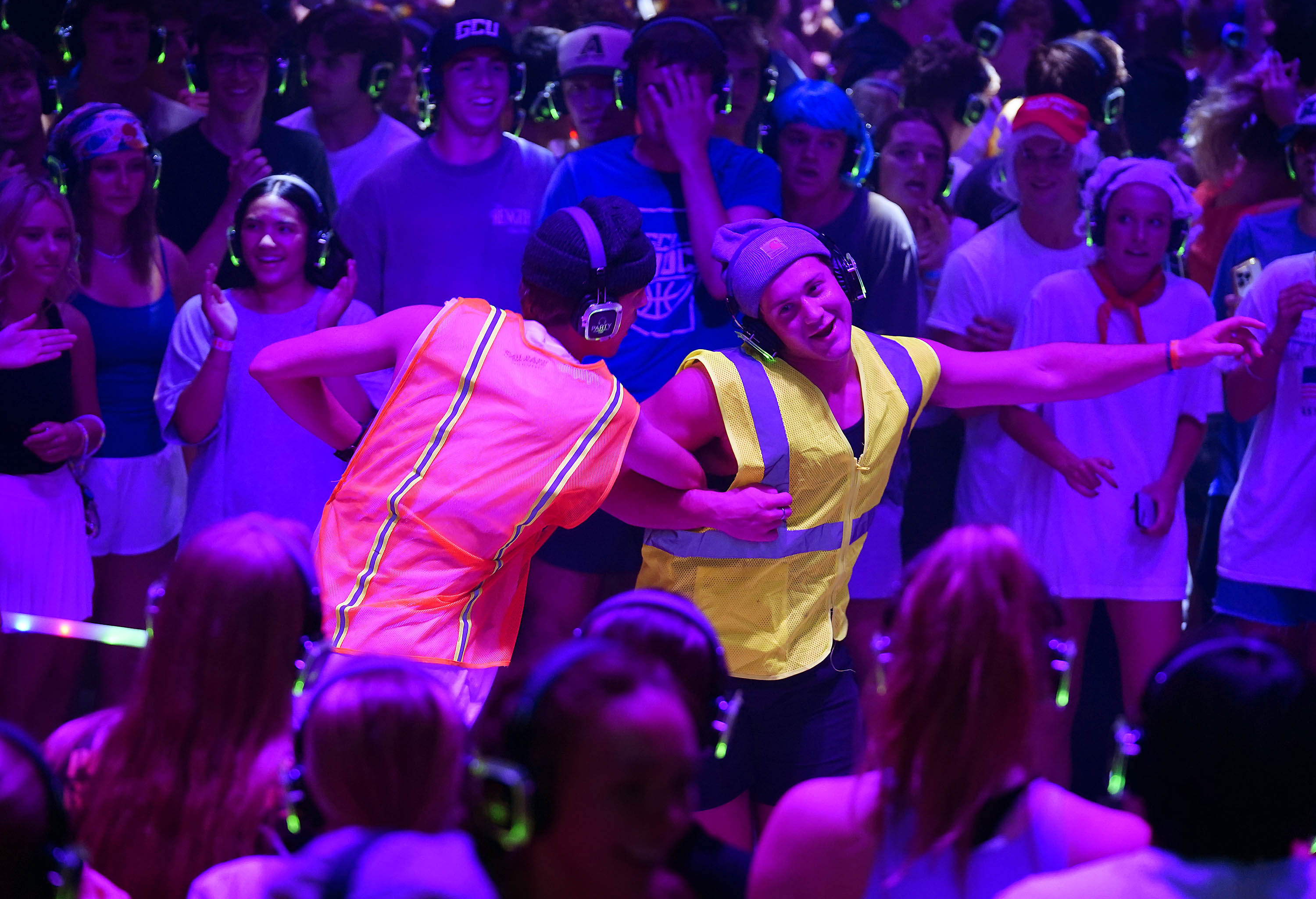 Students listen to music on the green headset channel during the Canyon Activities Board-sponsored Silent Disco at Global Credit Union Arena on Aug. 26, 2025. -