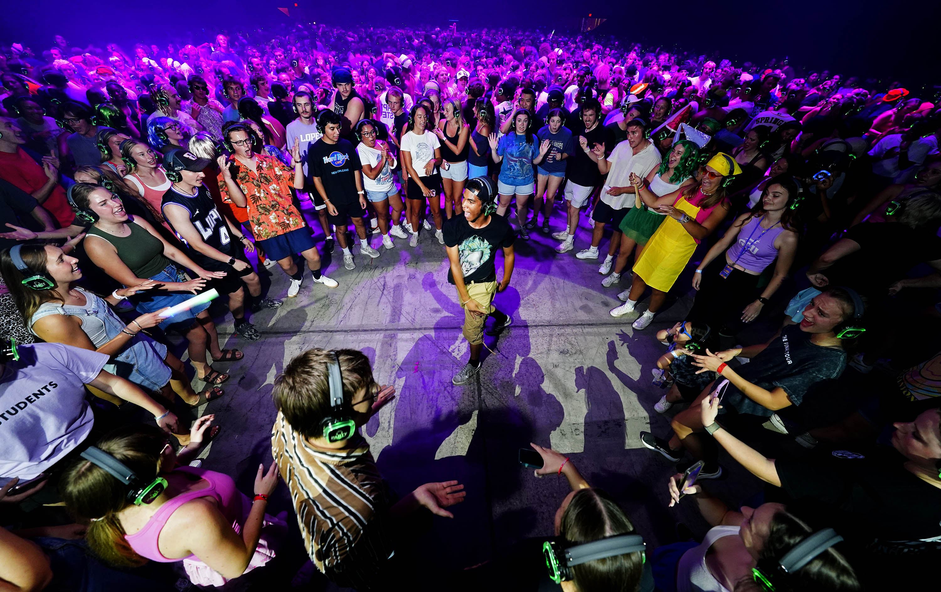 Students sing out to the music in their headsets during the Canyon Activities Board-sponsored Silent Disco at Global Credit Union Arena on Aug. 26, 2025. -
