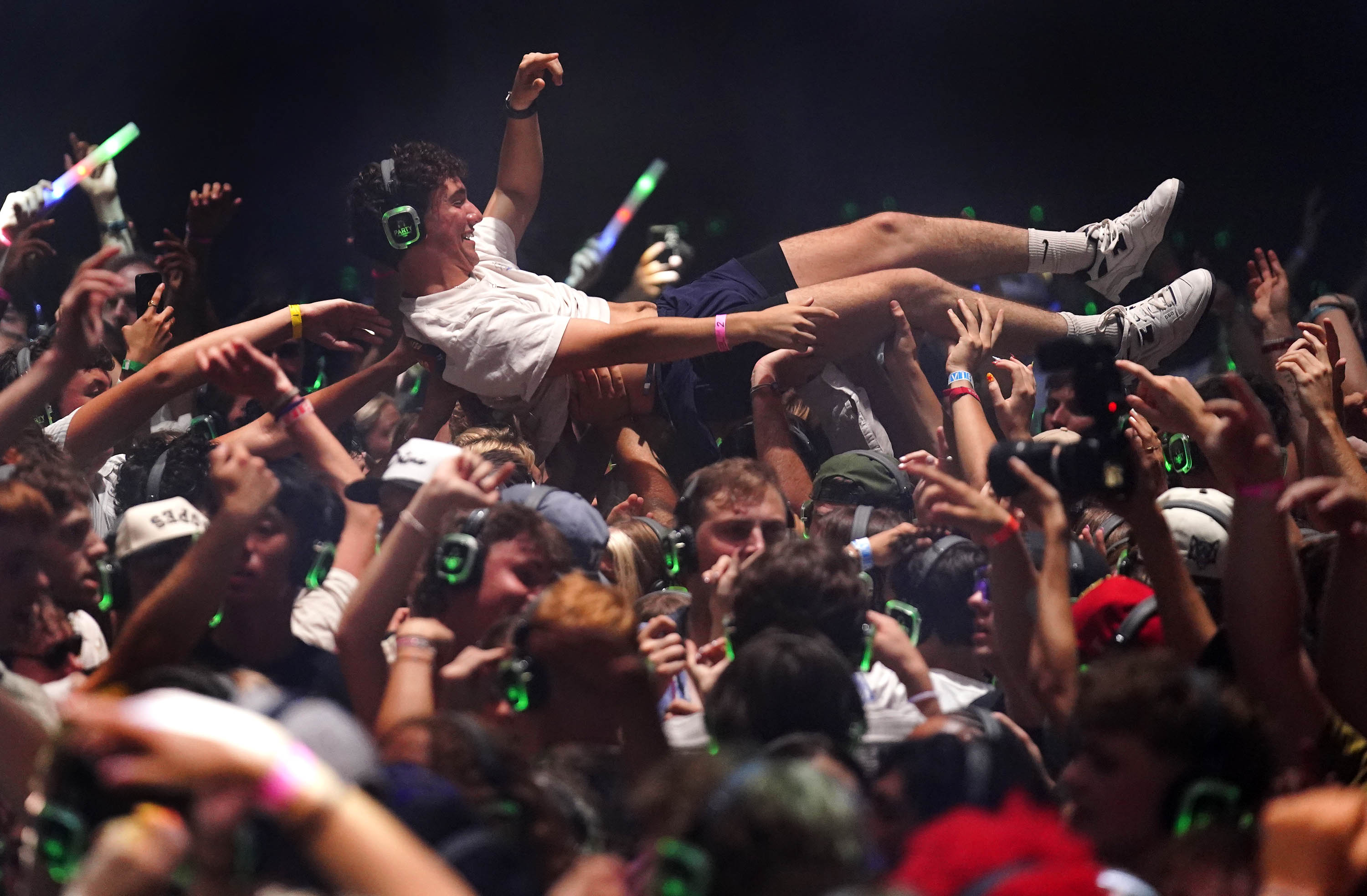 A student body surfs across the crowd during the Canyon Activities Board-sponsored Silent Disco at Global Credit Union Arena on Aug. 26, 2025. -