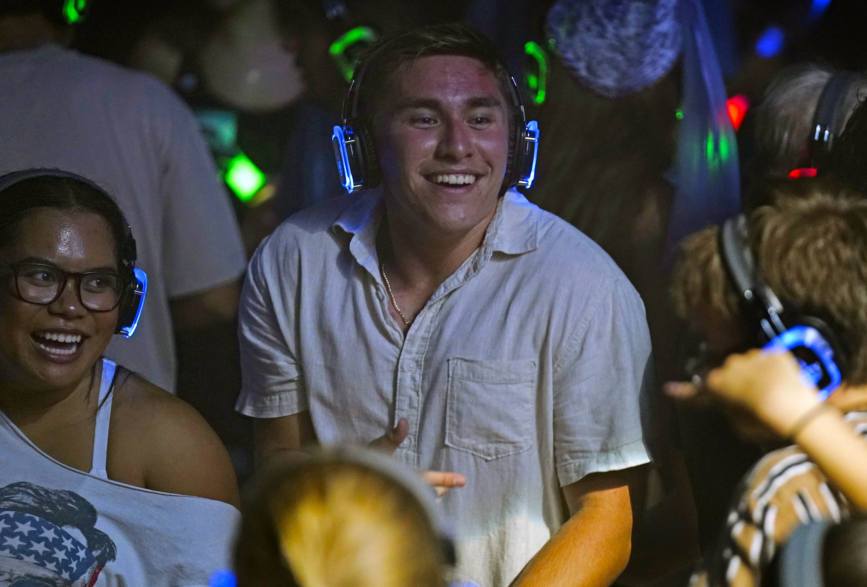 ASGCU president Tucker Hudson and vice-president Dianne Carla Mae Nasibog on the dance floor during the Canyon Activities Board-sponsored Silent Disco at Global Credit Union Arena on Aug. 26, 2025. -