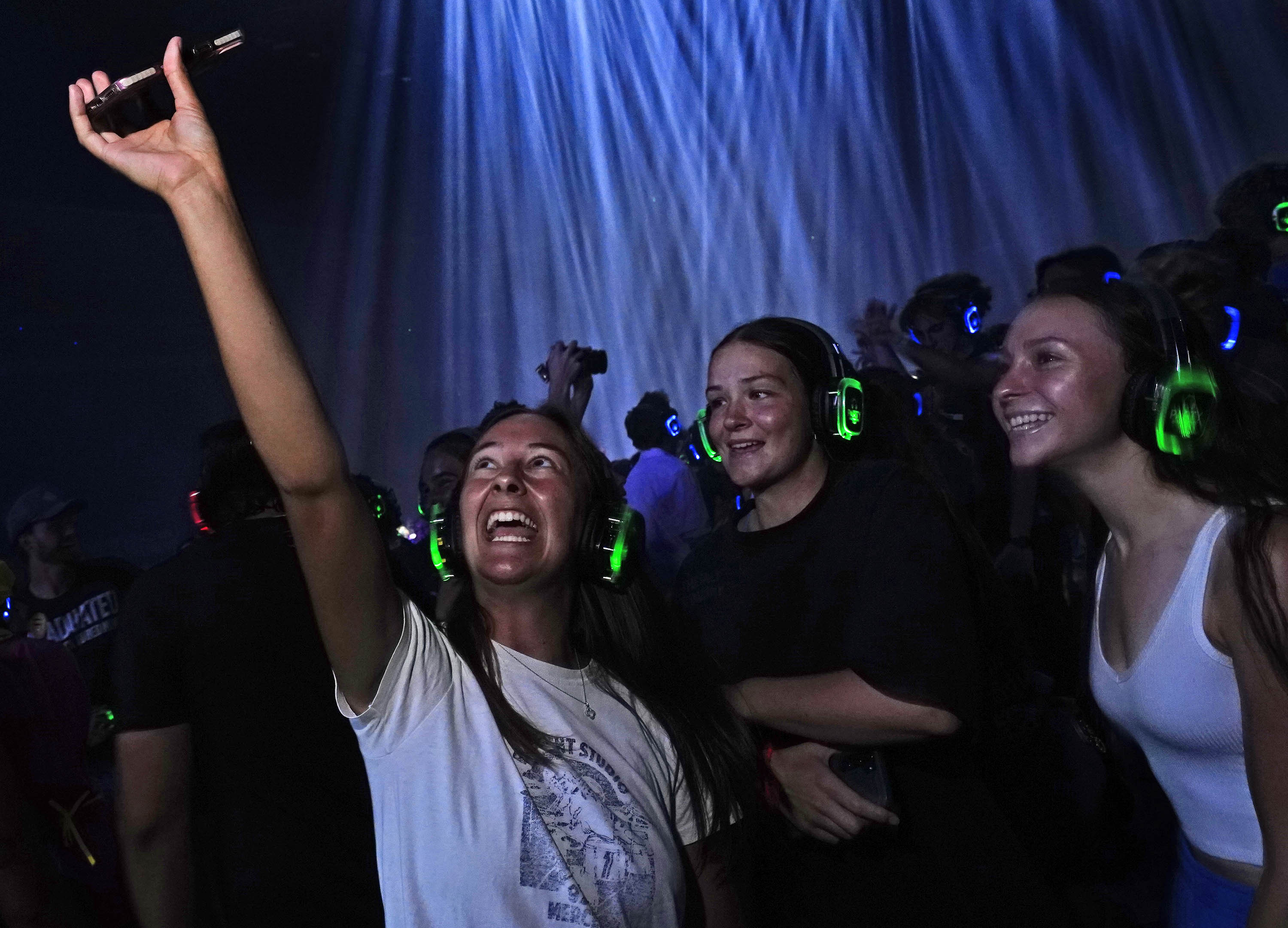 Students take a selfie as they dance during the Canyon Activities Board-sponsored Silent Disco at Global Credit Union Arena on Aug. 26, 2025. -