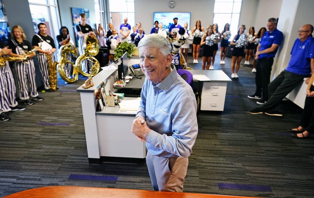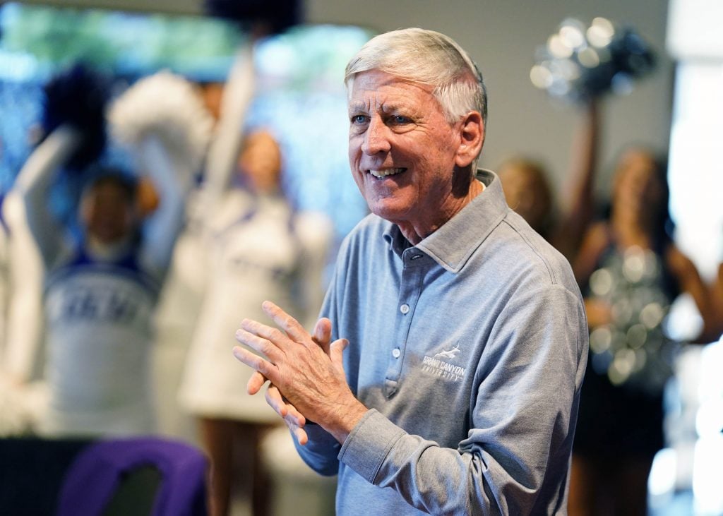 GCU President Brian Mueller applauds the performance of the Thundering Heard Pep Band and Spirit team as they perform in his office as part of Welcome Week festivities on Aug. 26, 2025. -