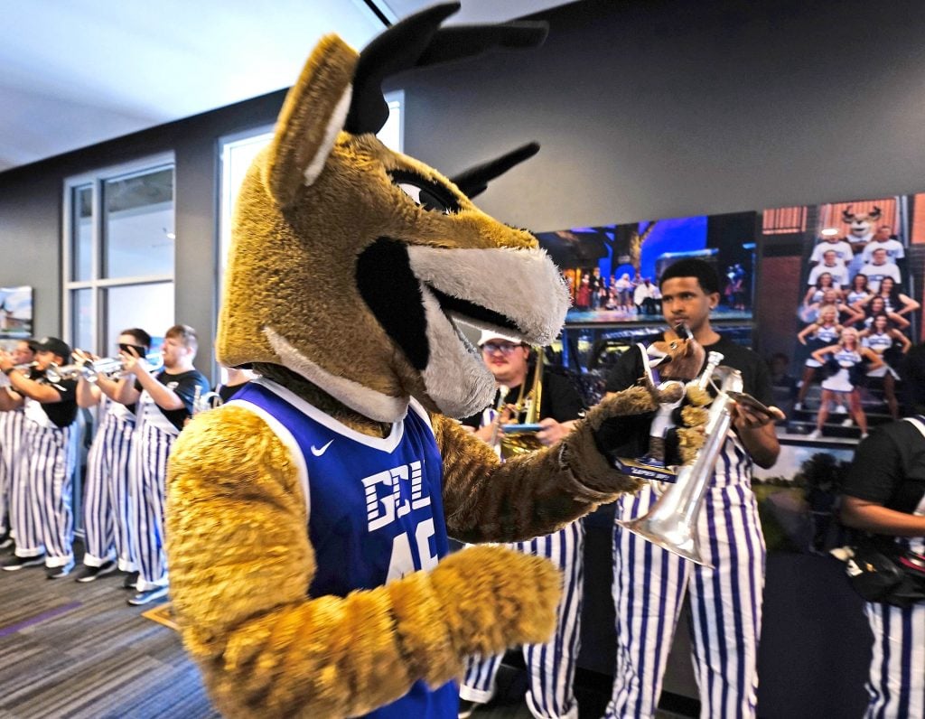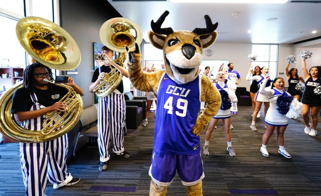 Thunder leads the GCU Thundering Heard Pep Band and Spirit team as they perform at President Brian Mueller’s office as part of Welcome Week festivities on Aug. 26, 2025. -