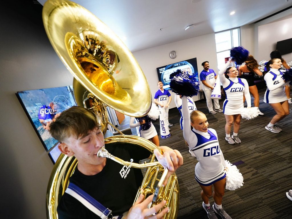 The GCU Thundering Heard Pep Band and Spirit team perform at president Brian Mueller’s office as part of Welcome Week festivities on Aug. 26, 2025. -
