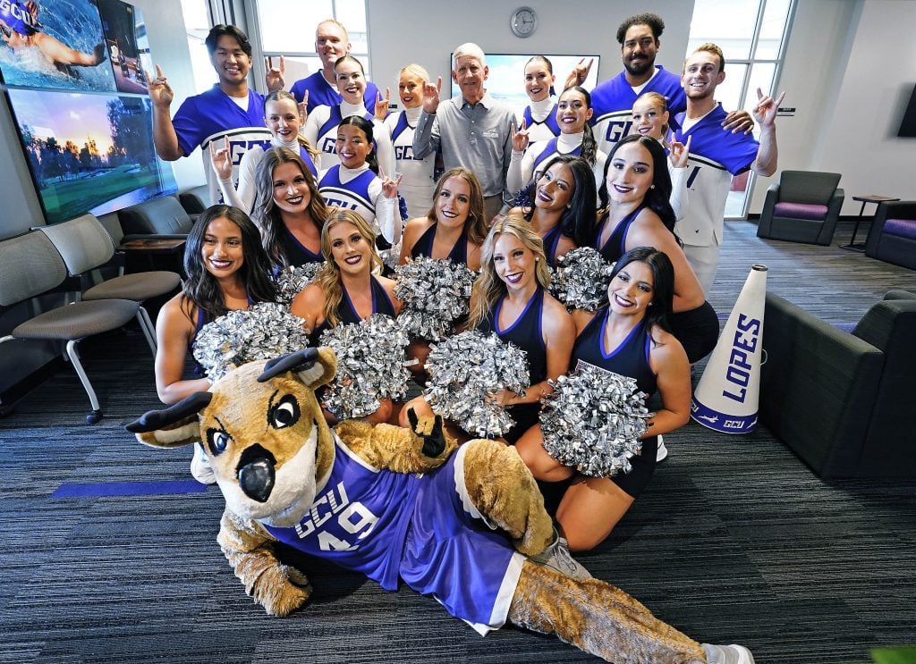 Thunder, along with members of GCU Cheer and Dance, pose for a photo with President Brian Mueller after performing in his office as part of Welcome Week festivities on Aug. 26, 2025.