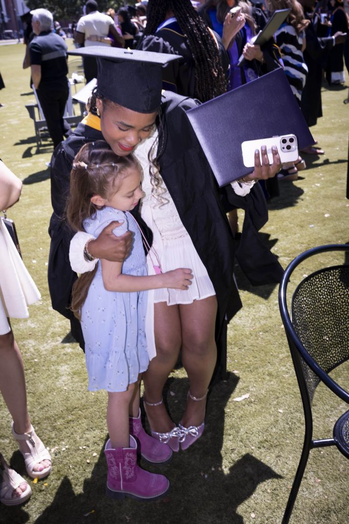 A graduate gets a big congratulations on the Quad after the Wednesday morning commencement ceremony, April 30, 2025. -