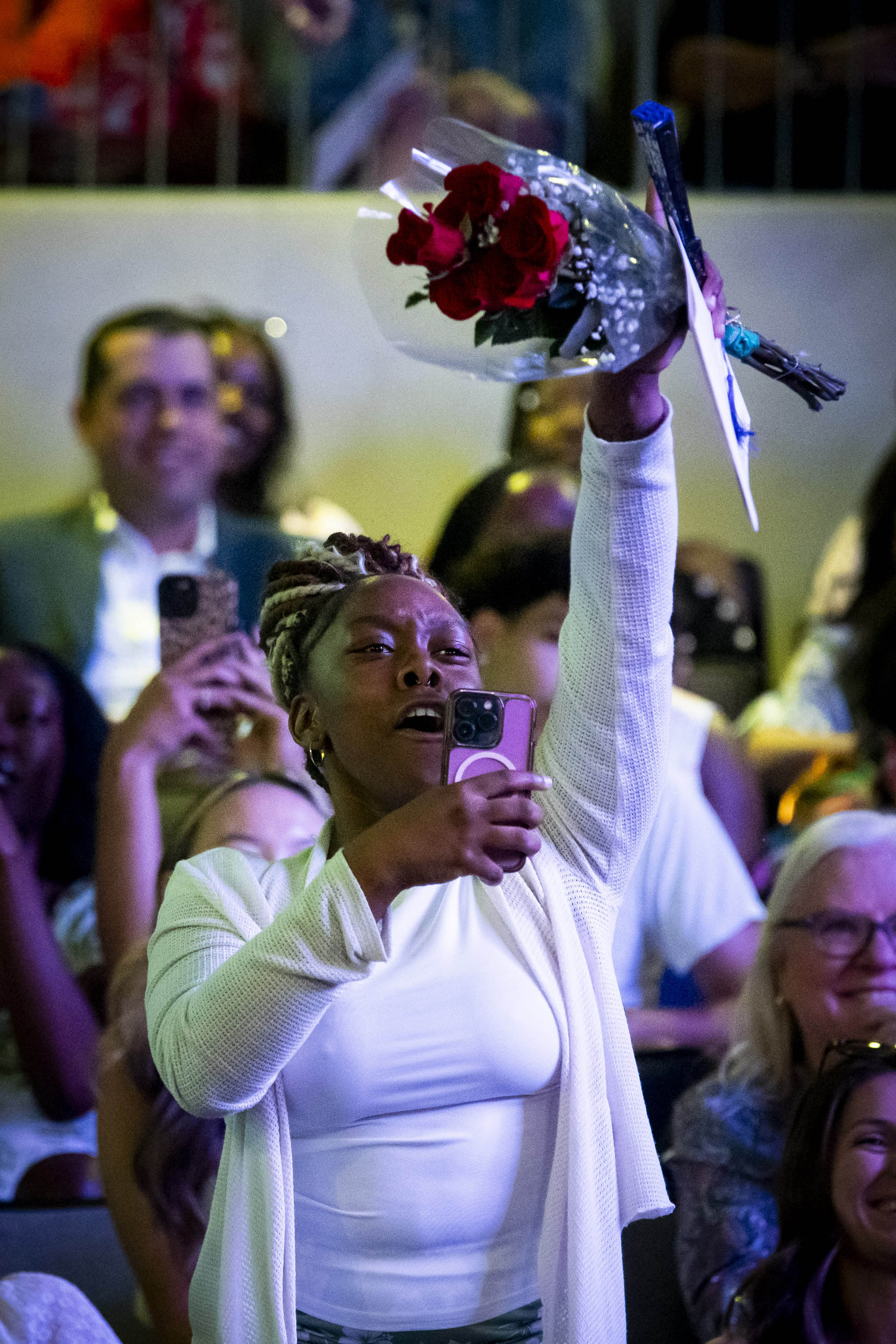Family members cheer for their graduates at the Wednesday morning commencement ceremony, April 30, 2025, for online and cohort students at Global Credit Union Arena. -