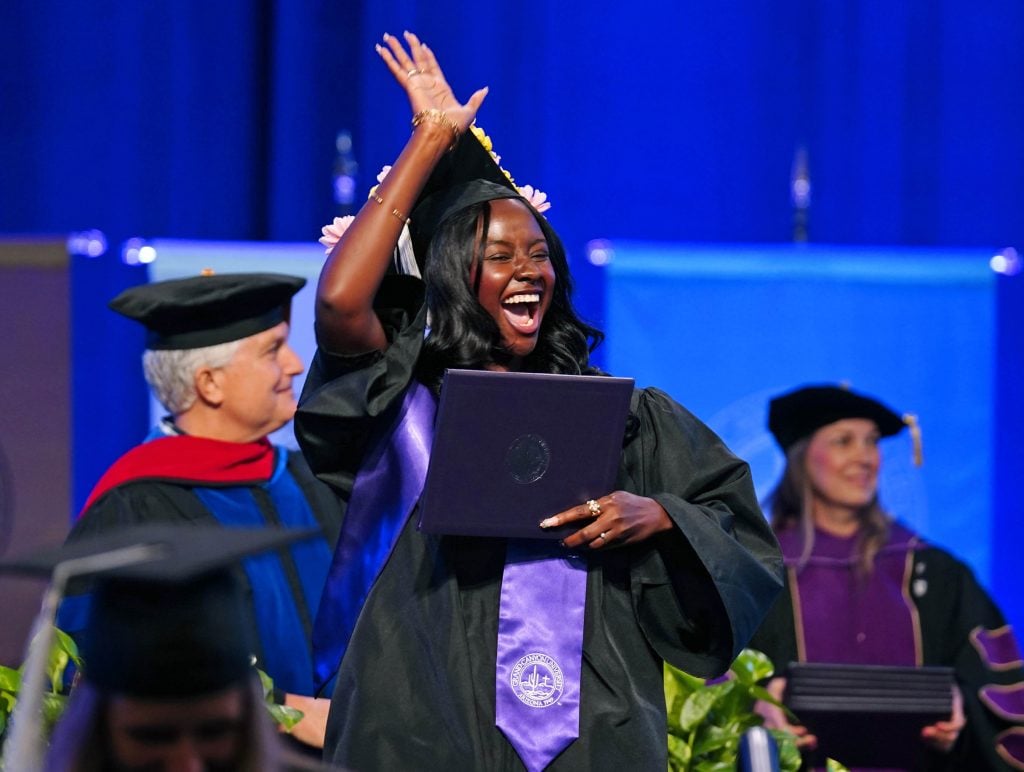 A graduate strikes a funny face after receiving her diploma during the Thursday morning spring commencement ceremony at Global Credit Union Arena on April 24, 2025. -