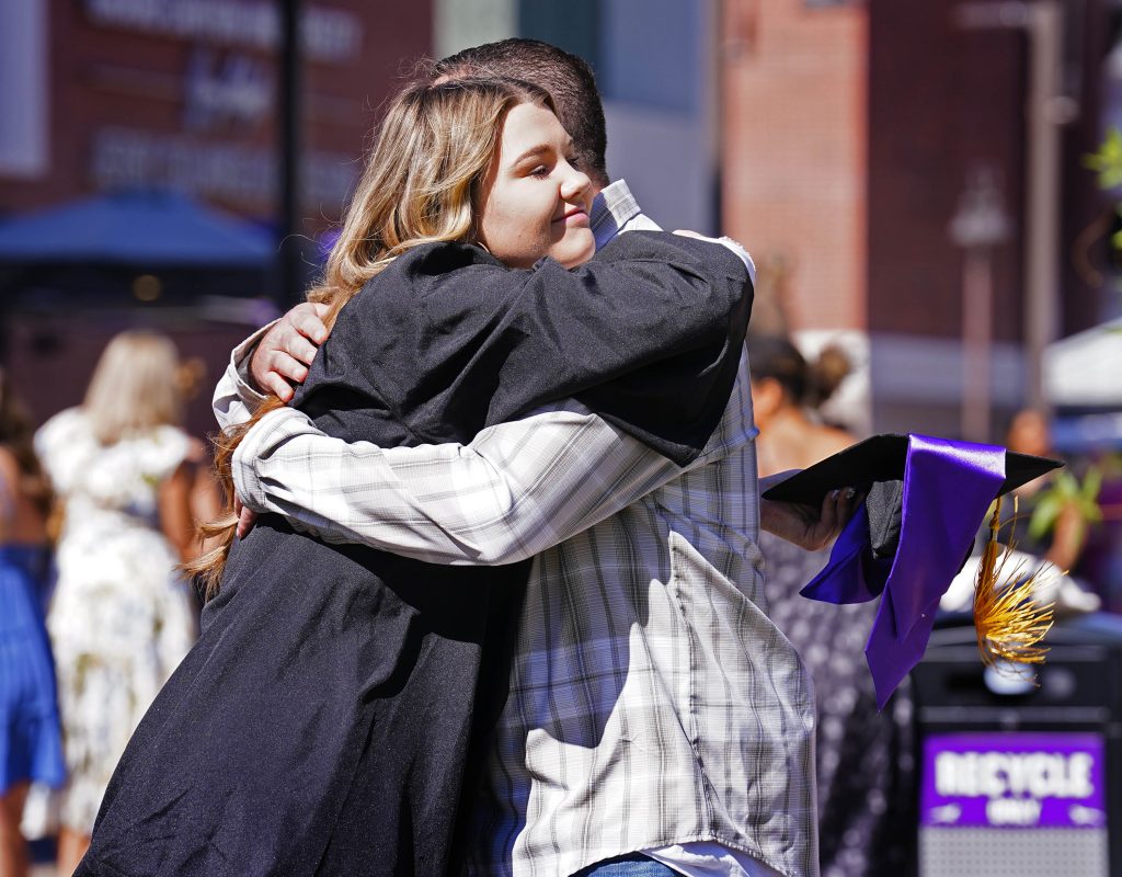 A graduate hugs a family member before entering the arena during the Wednesday morning spring commencement ceremony. -