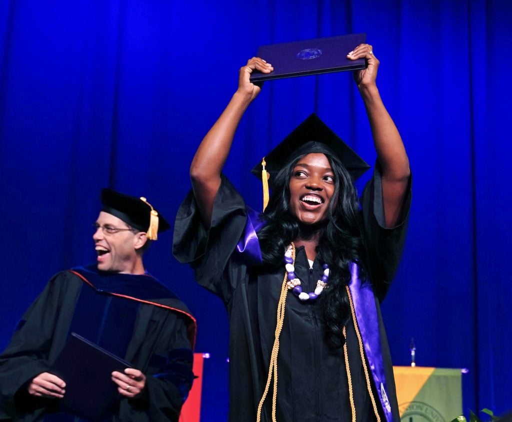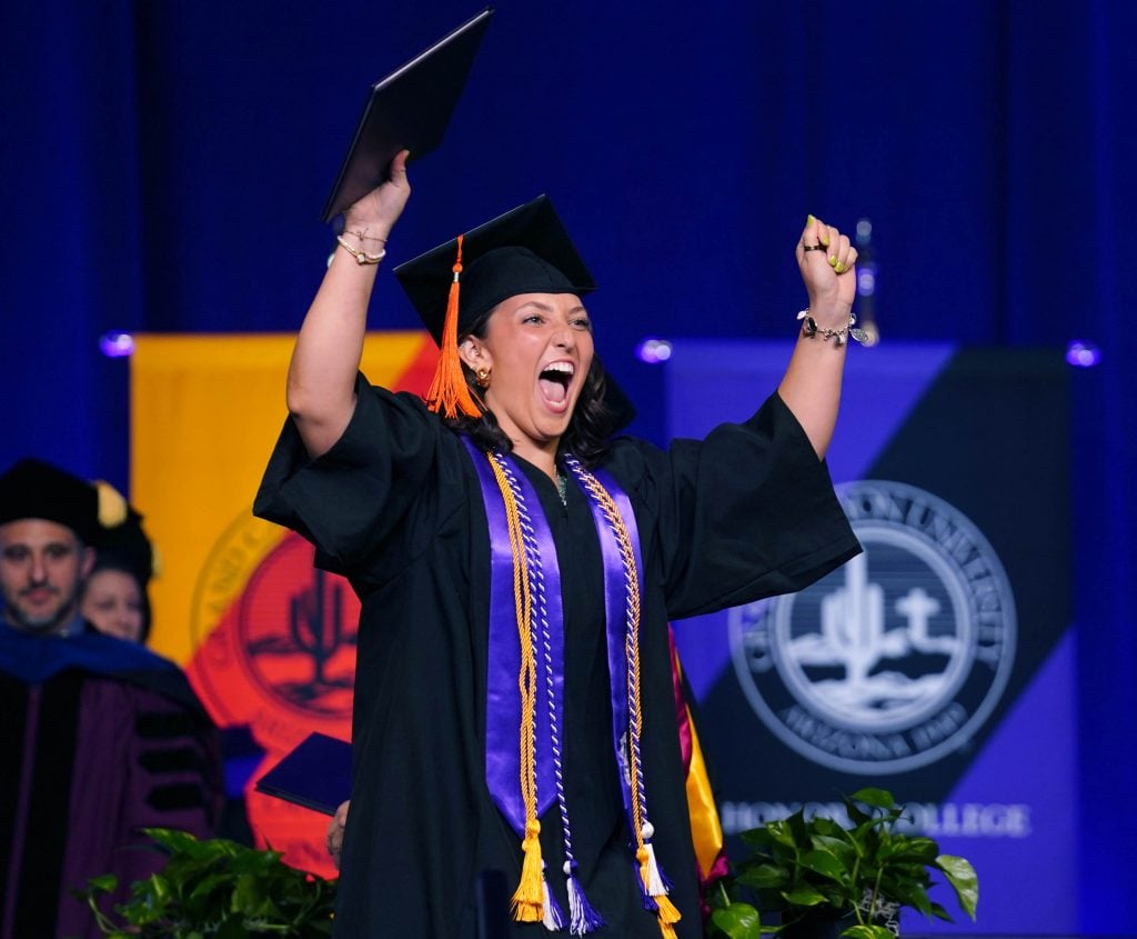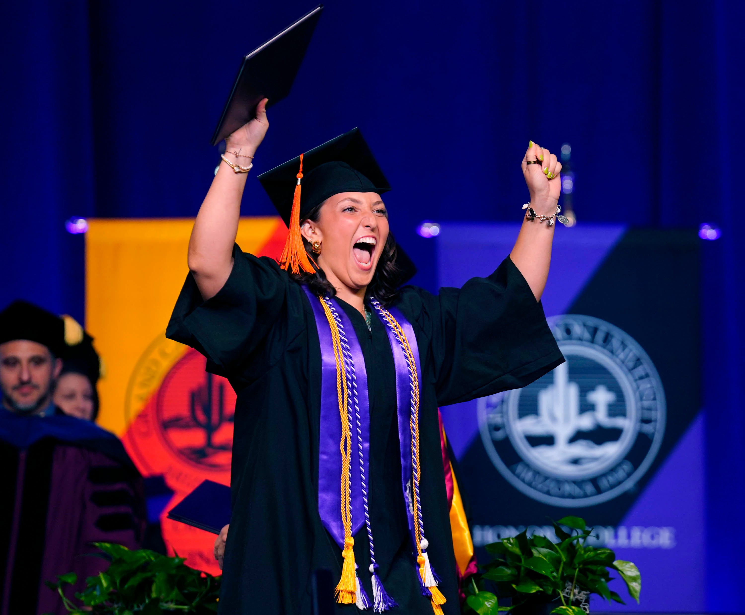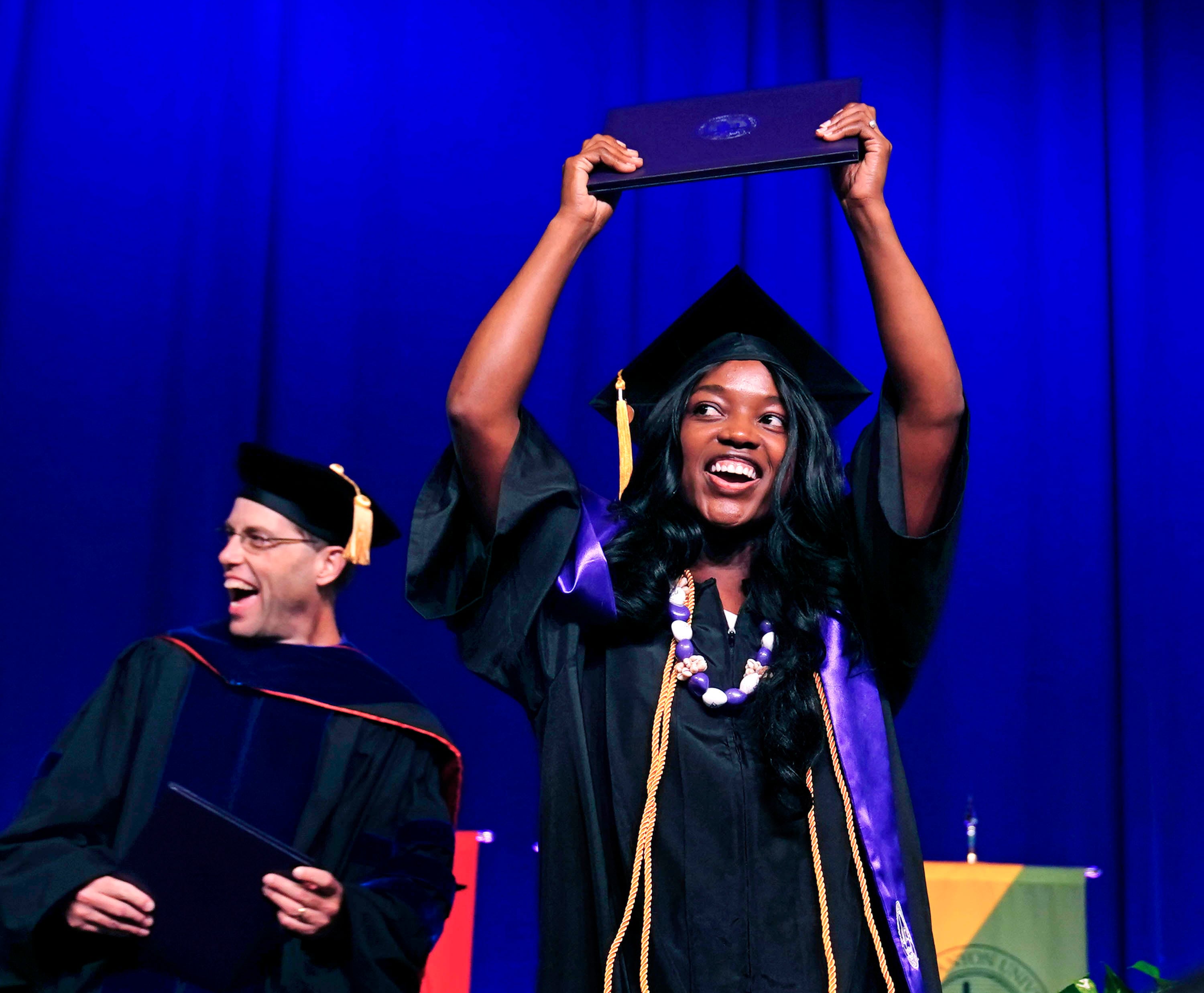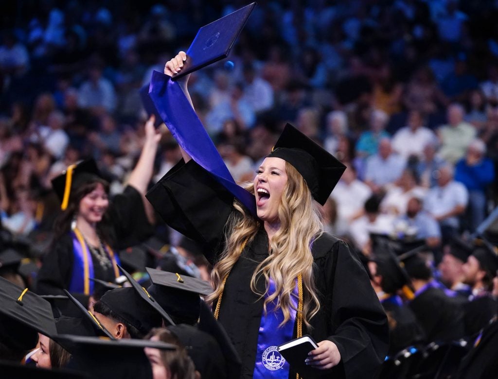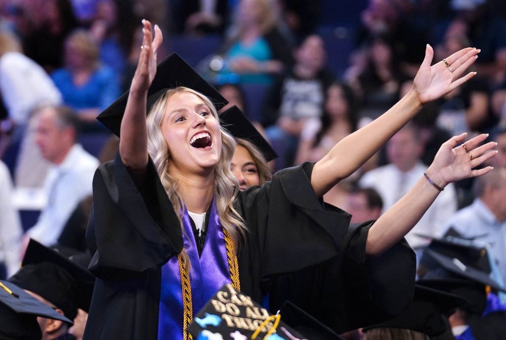 A graduate celebrates after receiving her diploma during the Thursday morning commencement ceremony at Global Credit Union Arena on April 23, 2026. -