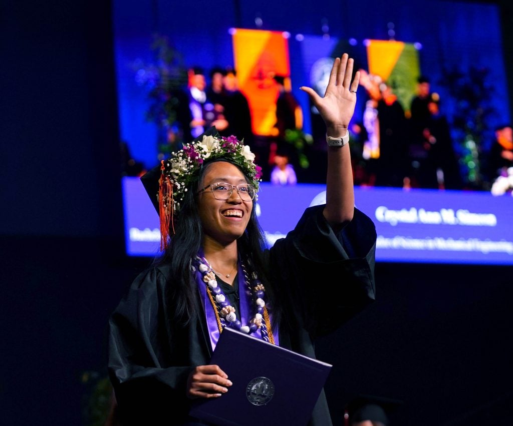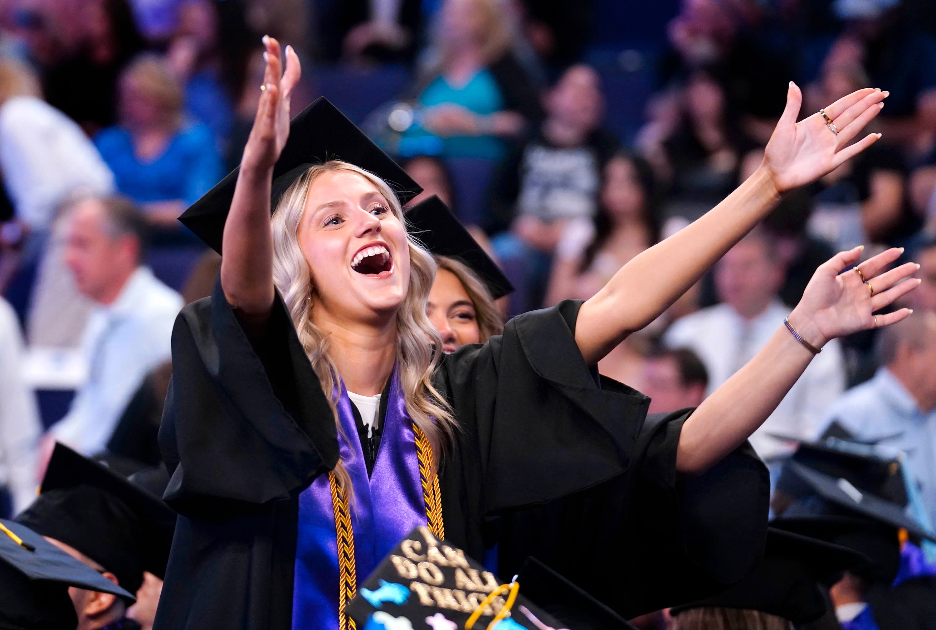 A graduate waves to family and friends after receiving her diploma during the Thursday morning commencement ceremony at Global Credit Union Arena on April 23, 2026. -