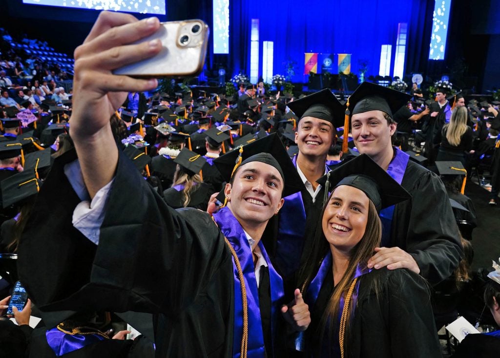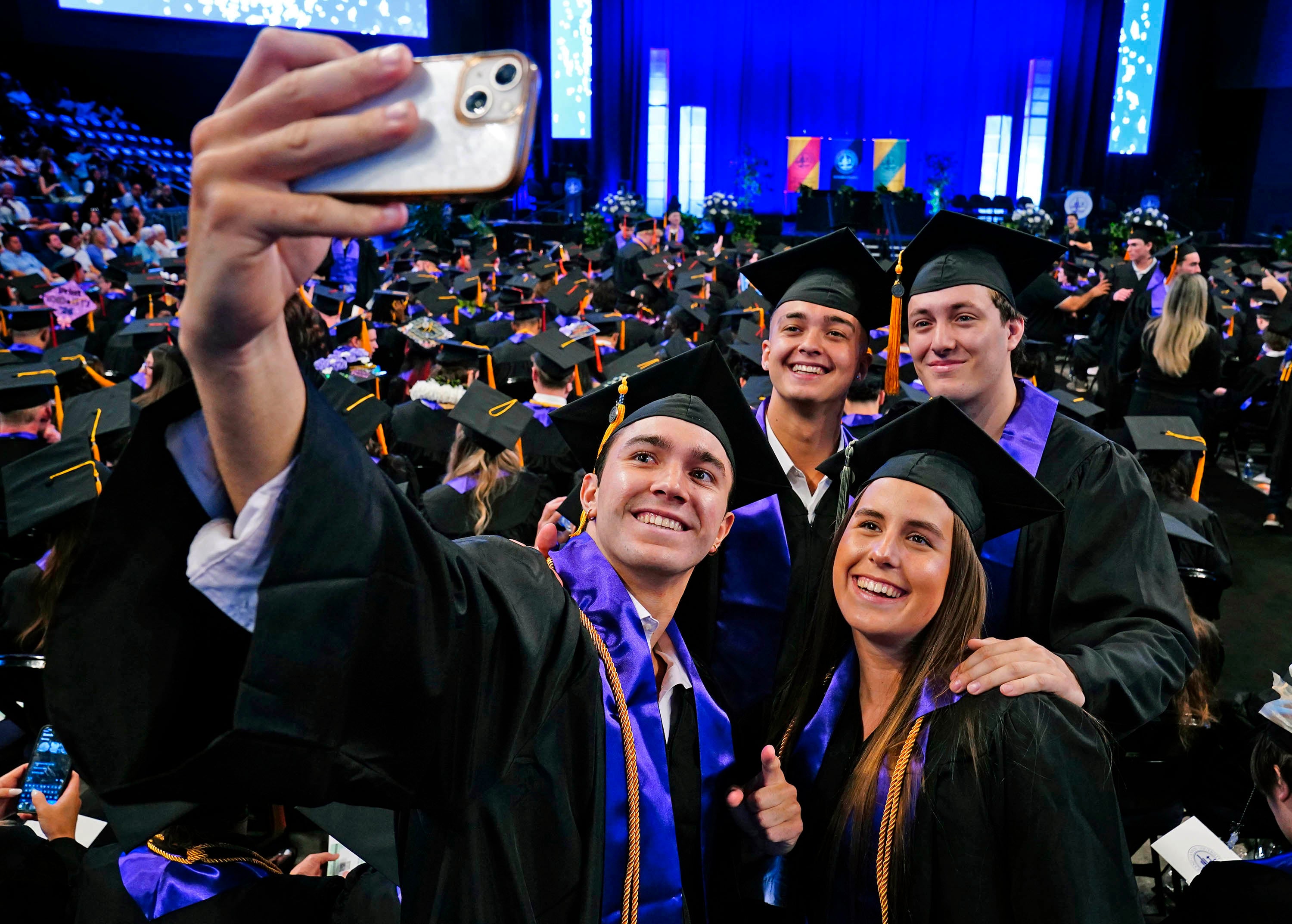 Graduates take a selfie before the start of the Thursday morning commencement ceremony for students in the College of Engineering and Technology and the College of Natural Sciences at Global Credit Union Arena on April 23, 2026. -