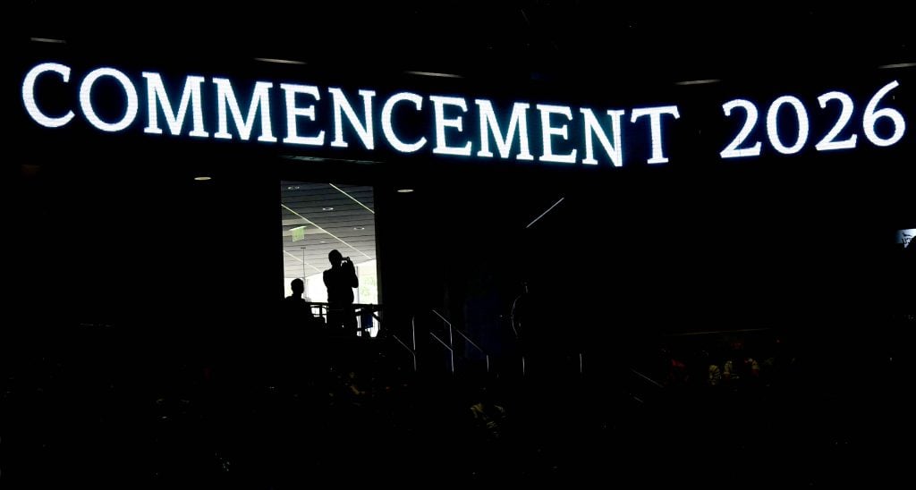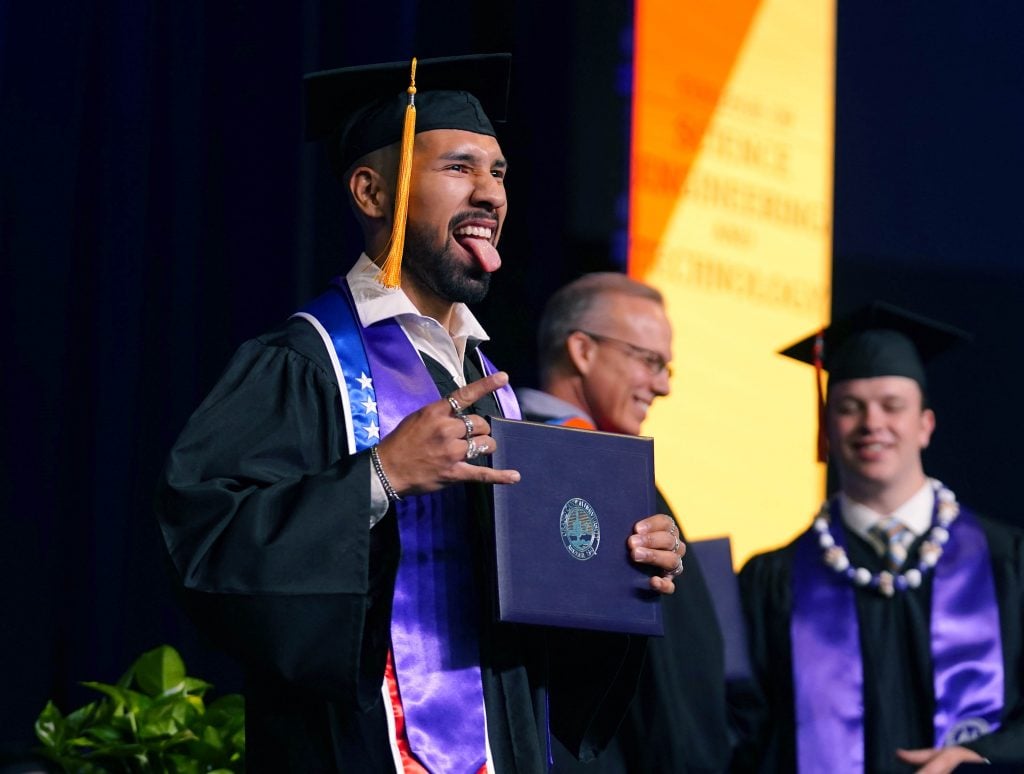 A graduate celebrates after receiving his diploma during the Thursday morning commencement ceremony at Global Credit Union Arena on April 23, 2026. -