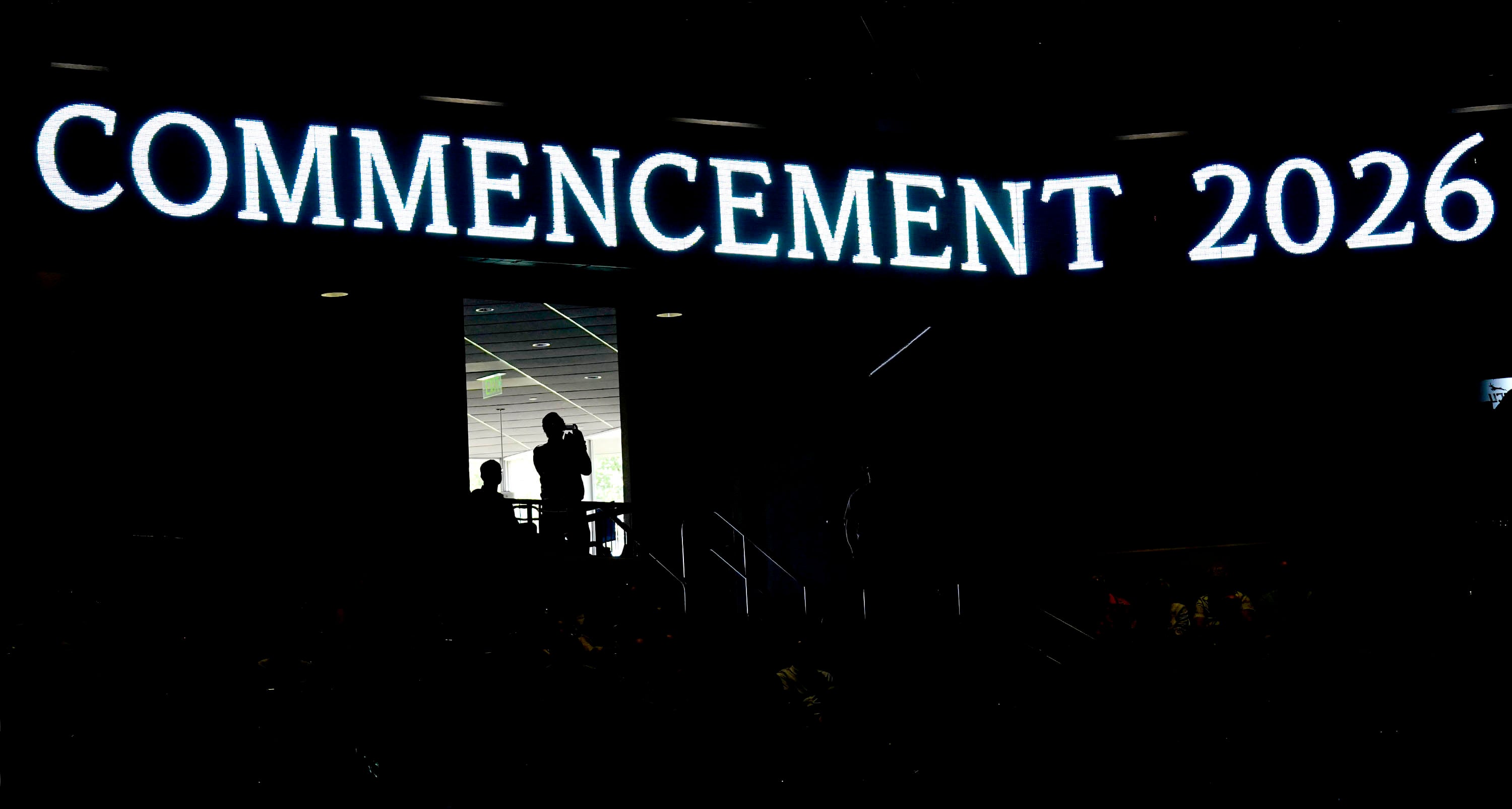 An attendee watches from an entryway to the arena during the Thursday morning commencement ceremony for students in the College of Engineering and Technology and the College of Natural Sciences at Global Credit Union Arena on April 23, 2026. -