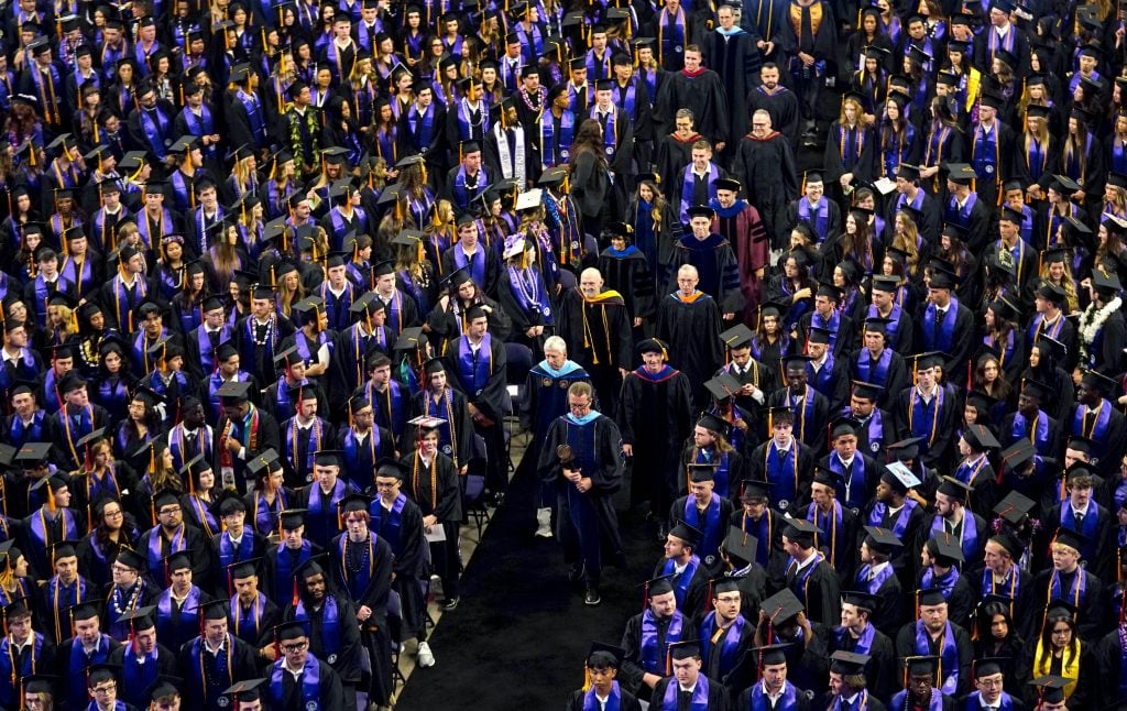 The processional makes its way to the stage past the graduates during the Thursday morning commencement ceremony at Global Credit Union Arena on April 23, 2026. -