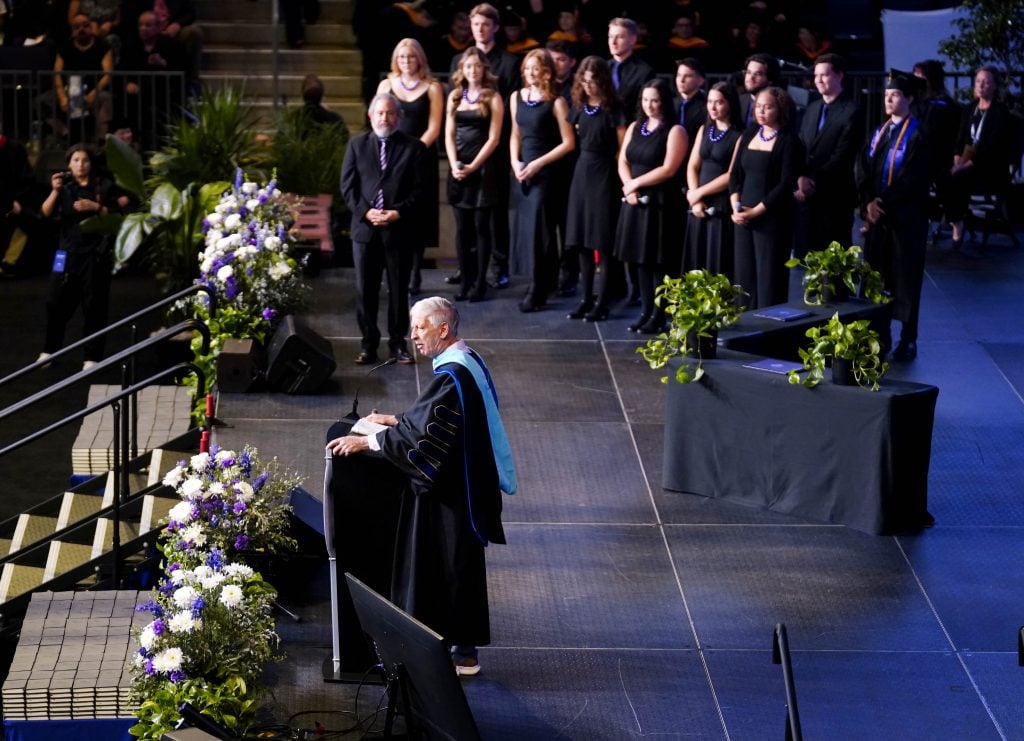 University President Brian Mueller addresses the 2026 graduates during the Thursday morning commencement ceremony at Global Credit Union Arena on April 23, 2026. -