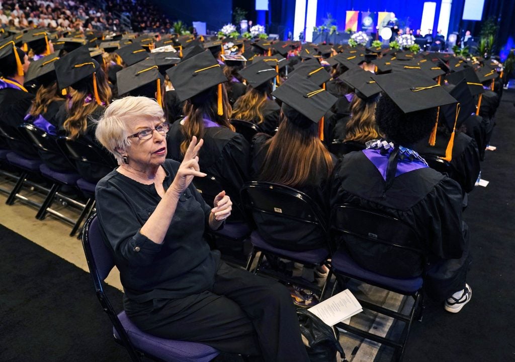 Penny Posedley signs university President Brian Mueller's speech for those with hearing impairment during the Thursday morning commencement ceremony at Global Credit Union Arena on April 23, 2026. -