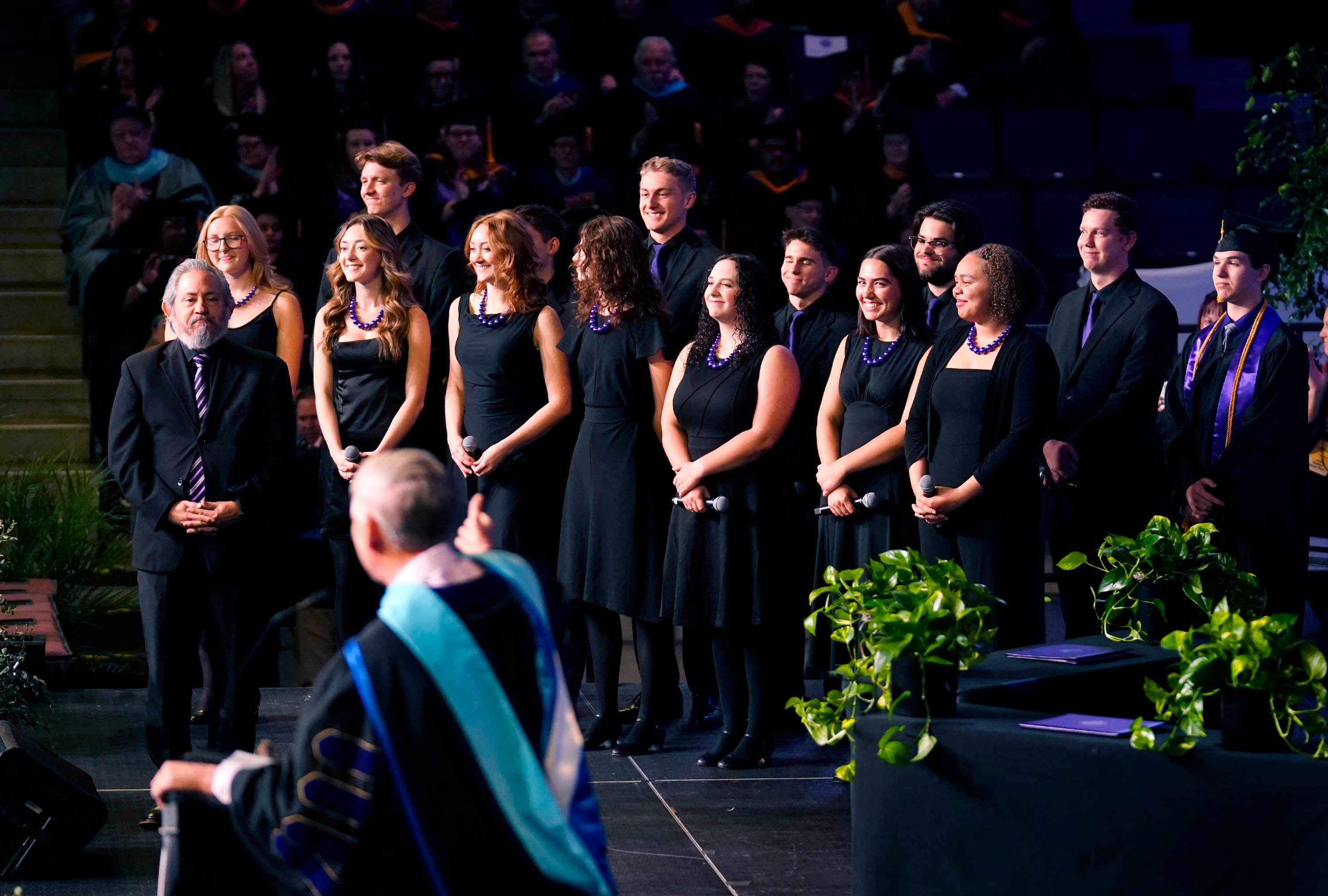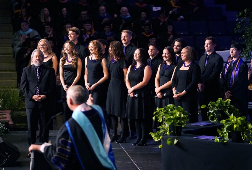 University President Brian Mueller recognizes Critical Mass and their invitation to take part in the America 250 celebration in Washington, D.C., during the Thursday morning commencement ceremony at Global Credit Union Arena on April 23, 2026. -