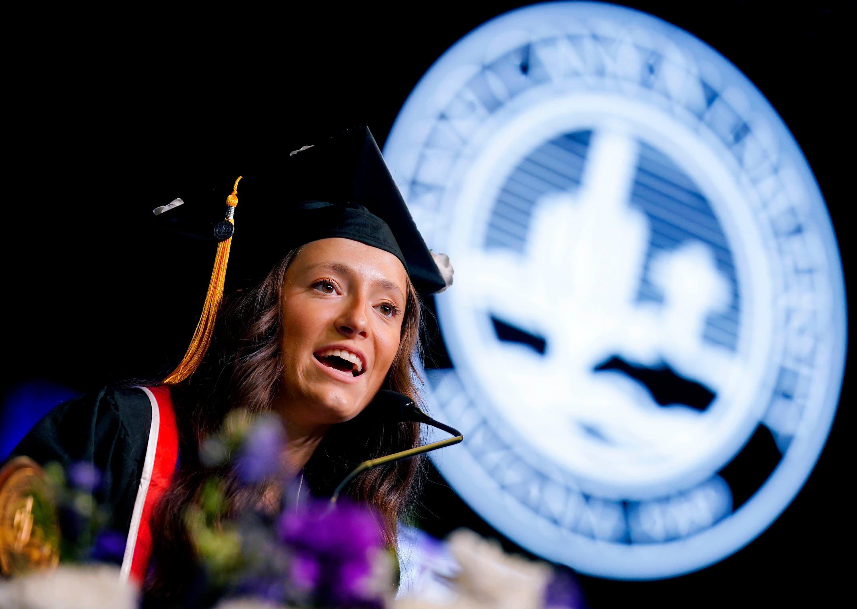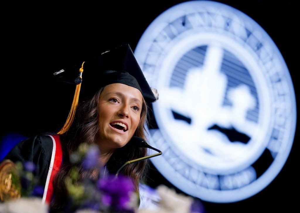 Student speaker Alex Dixon addresses her fellow graduates during the Thursday morning commencement ceremony at Global Credit Union Arena on April 23, 2026. -