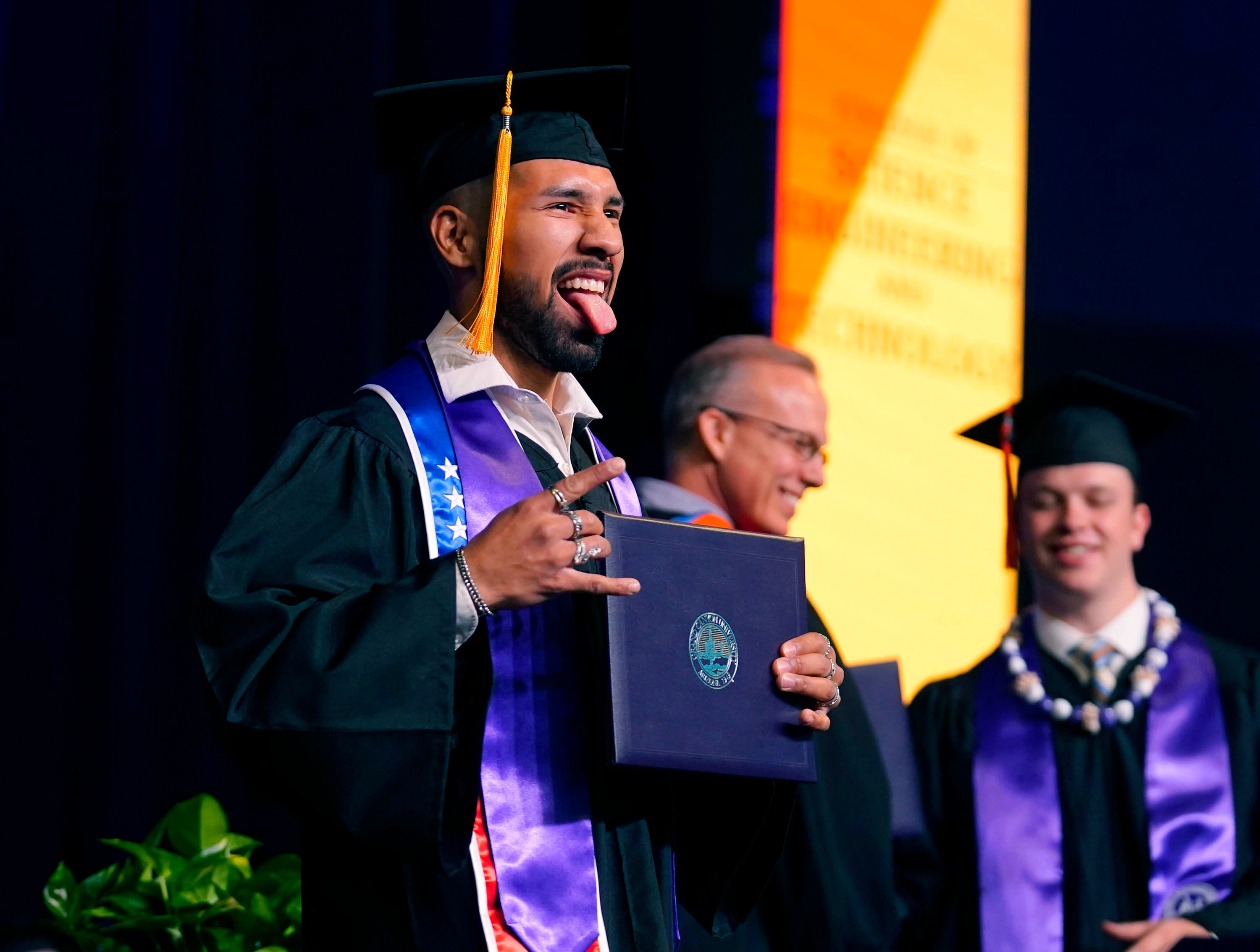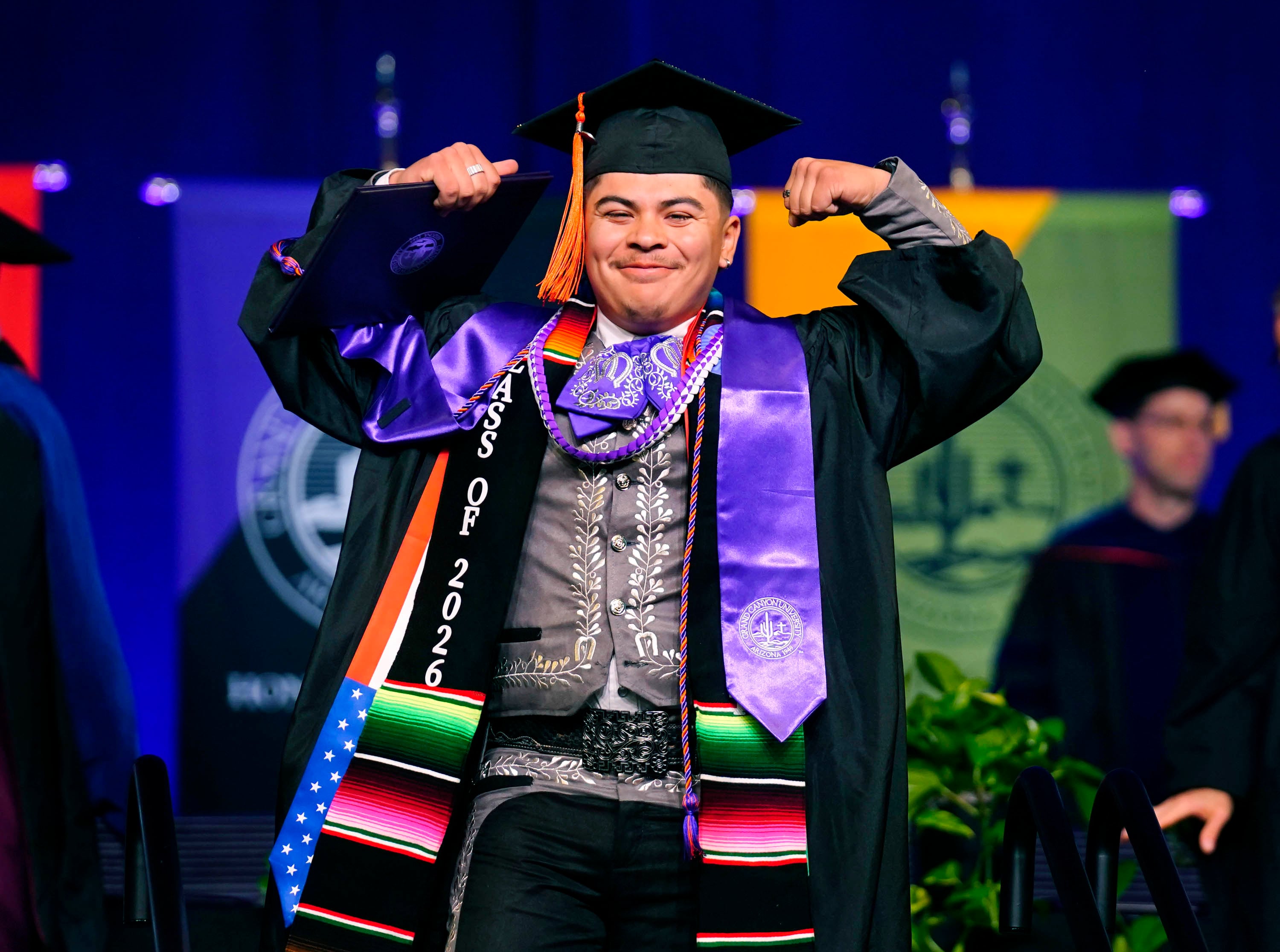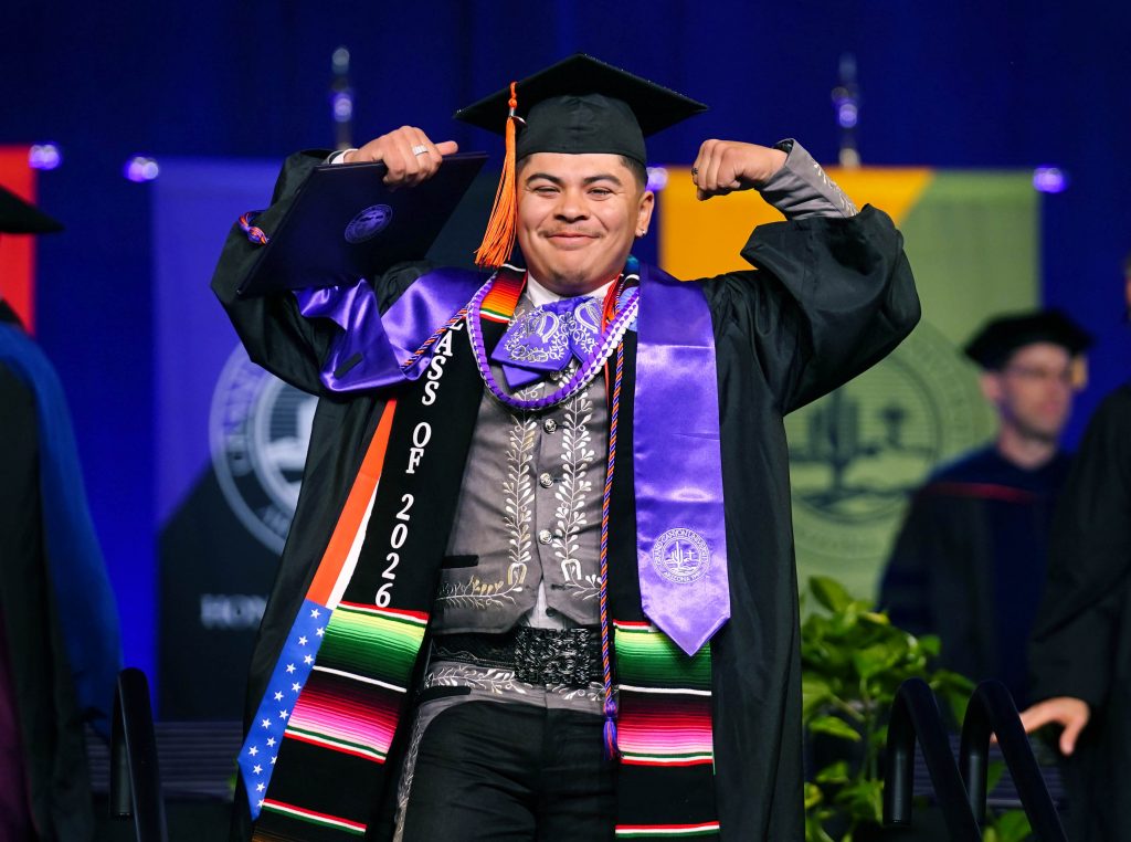 A graduate flexes some muscle after receiving his diploma during the Thursday morning commencement ceremony at Global Credit Union Arena on April 23, 2026. -