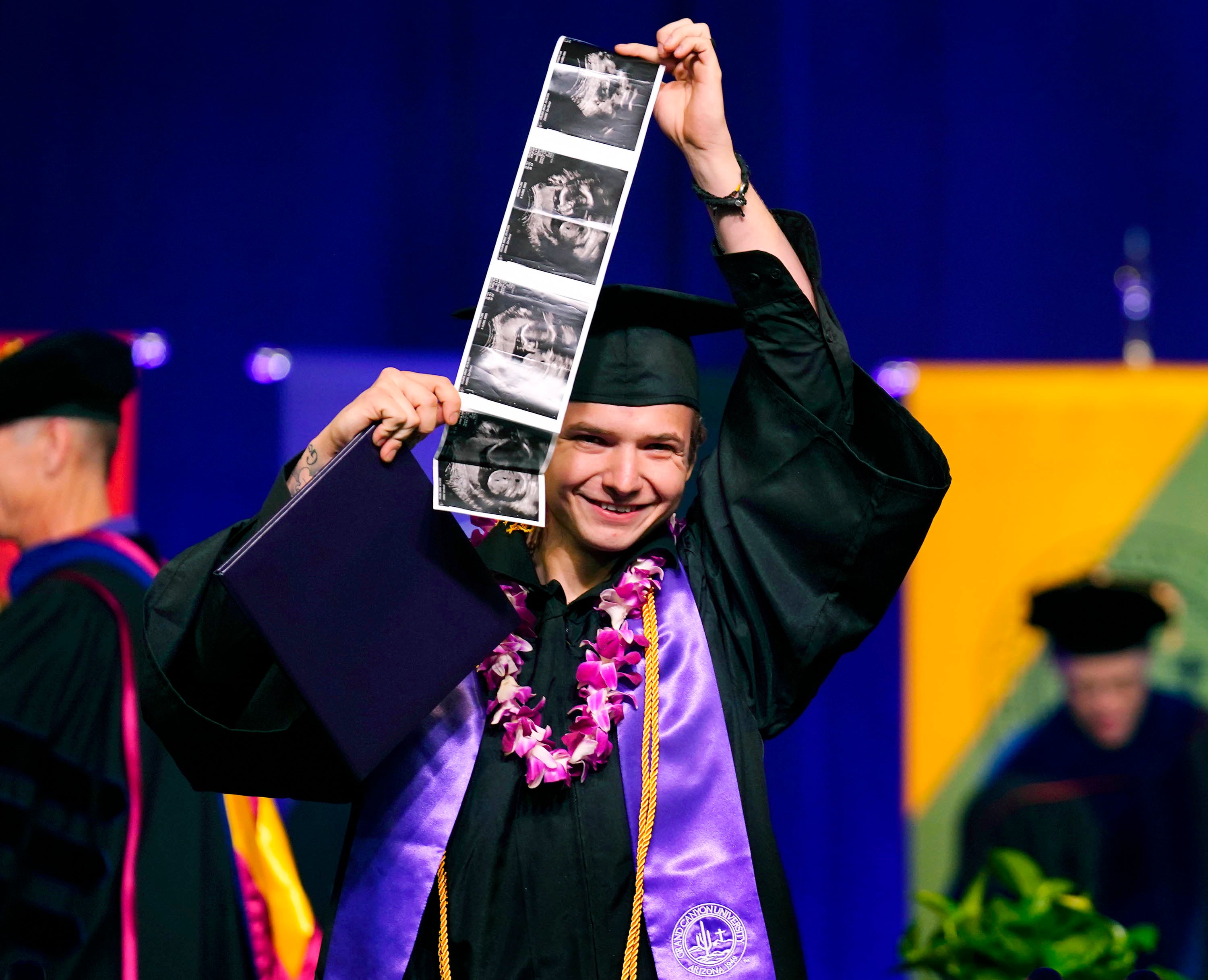 A graduate displays ultrasound images of himself during the Thursday morning commencement ceremony at Global Credit Union Arena on April 23, 2026. -