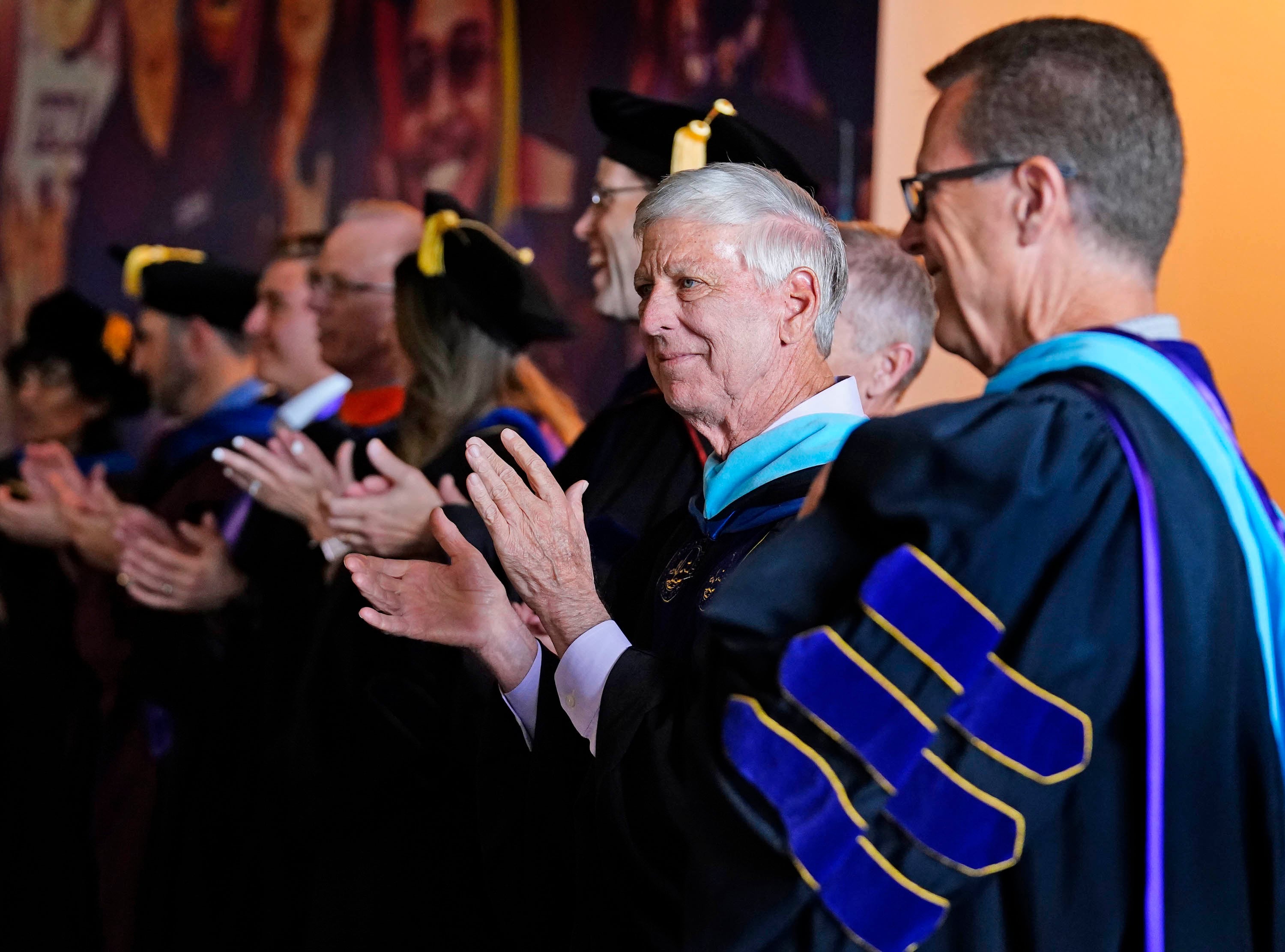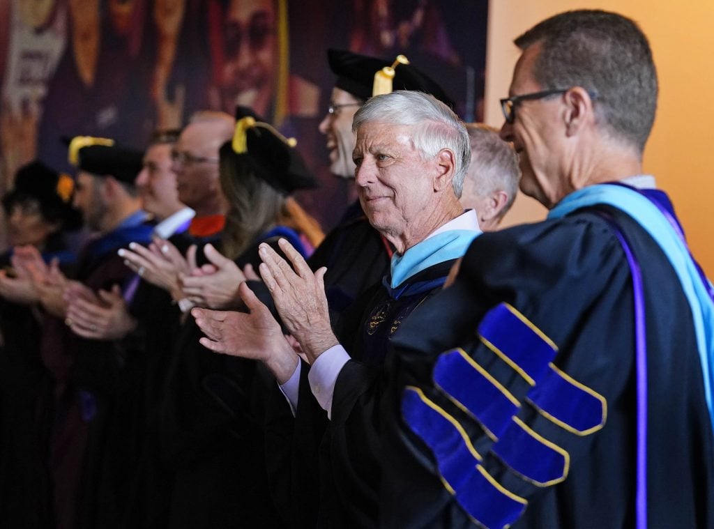 University President Brian Mueller and faculty applaud the 2026 graduates as they exit the arena during the Thursday morning commencement ceremony at Global Credit Union Arena on April 23, 2026. -