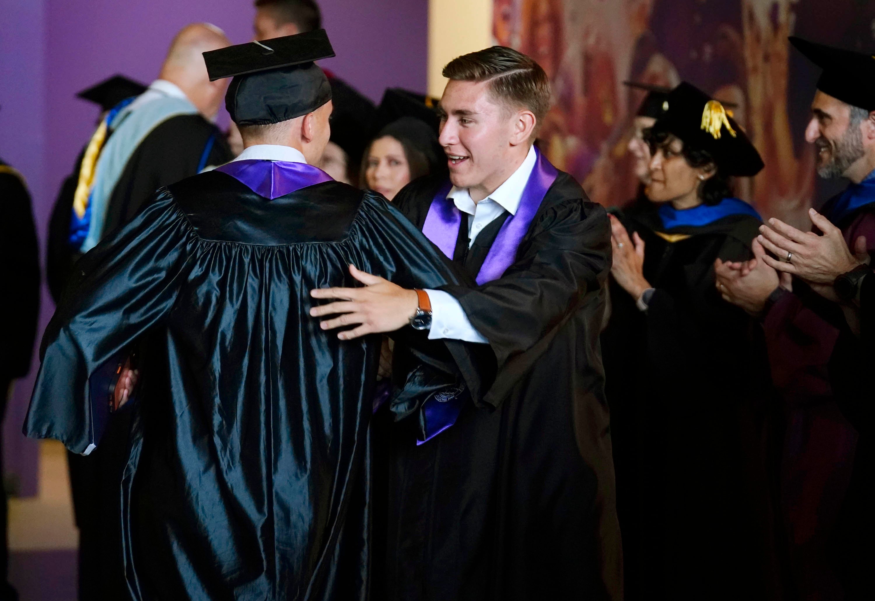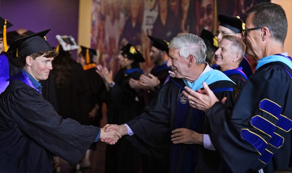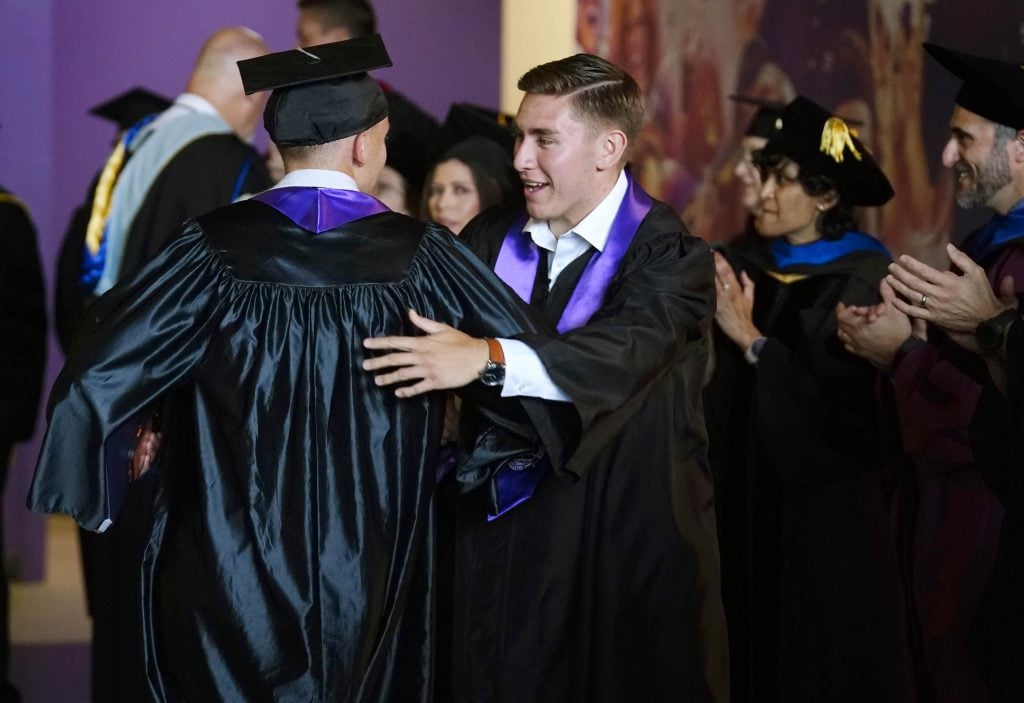 Associated Students of GCU President Tucker Hudson congratulates a fellow classmate as he exits the arena following the Thursday morning commencement ceremony at Global Credit Union Arena on April 23, 2026. -