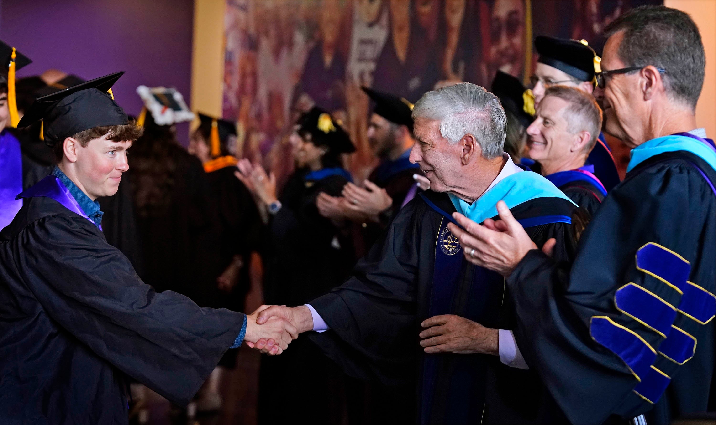University President Brian Mueller congratulates a graduate as he exits the arena following the Thursday morning commencement ceremony at Global Credit Union Arena on April 23, 2026. -
