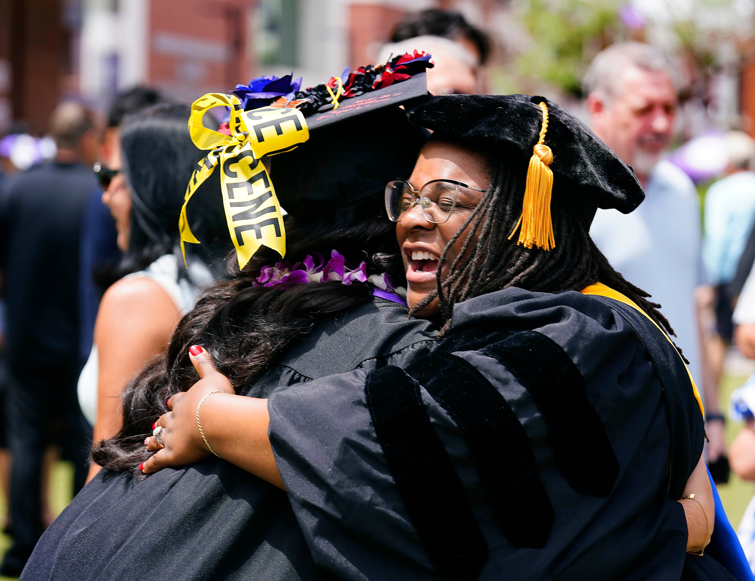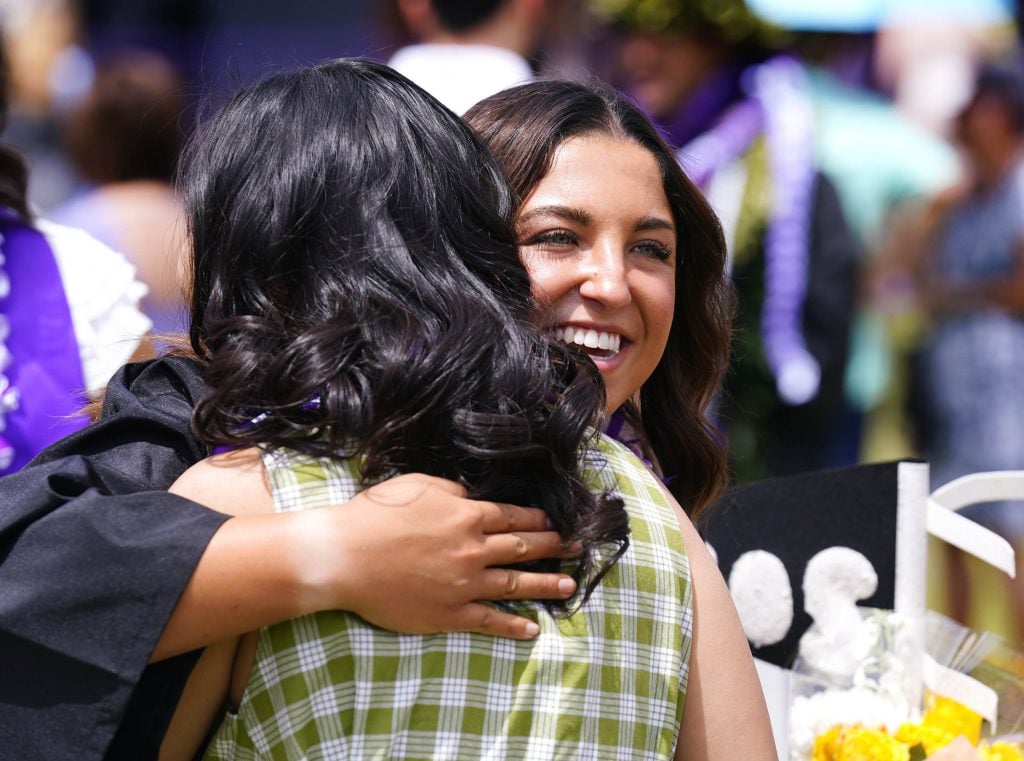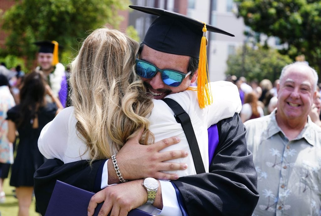 Graduates are greeted with hugs from family members on the Quad following the Thursday morning commencement ceremony at Global Credit Union Arena on April 23, 2026. -