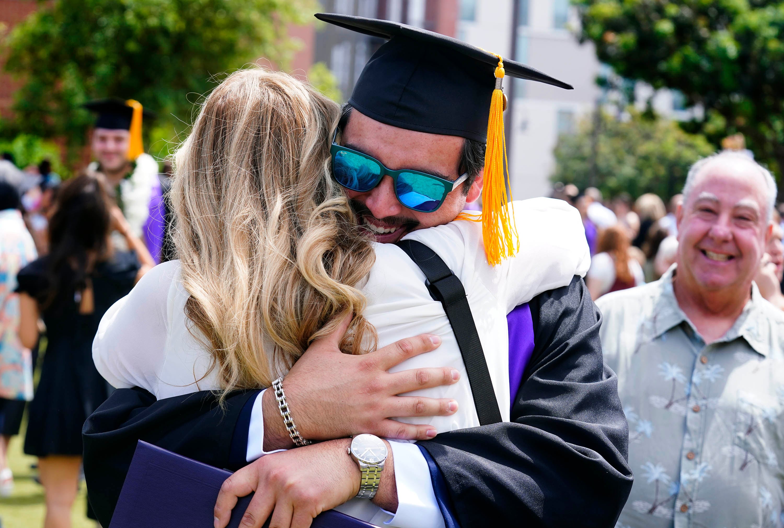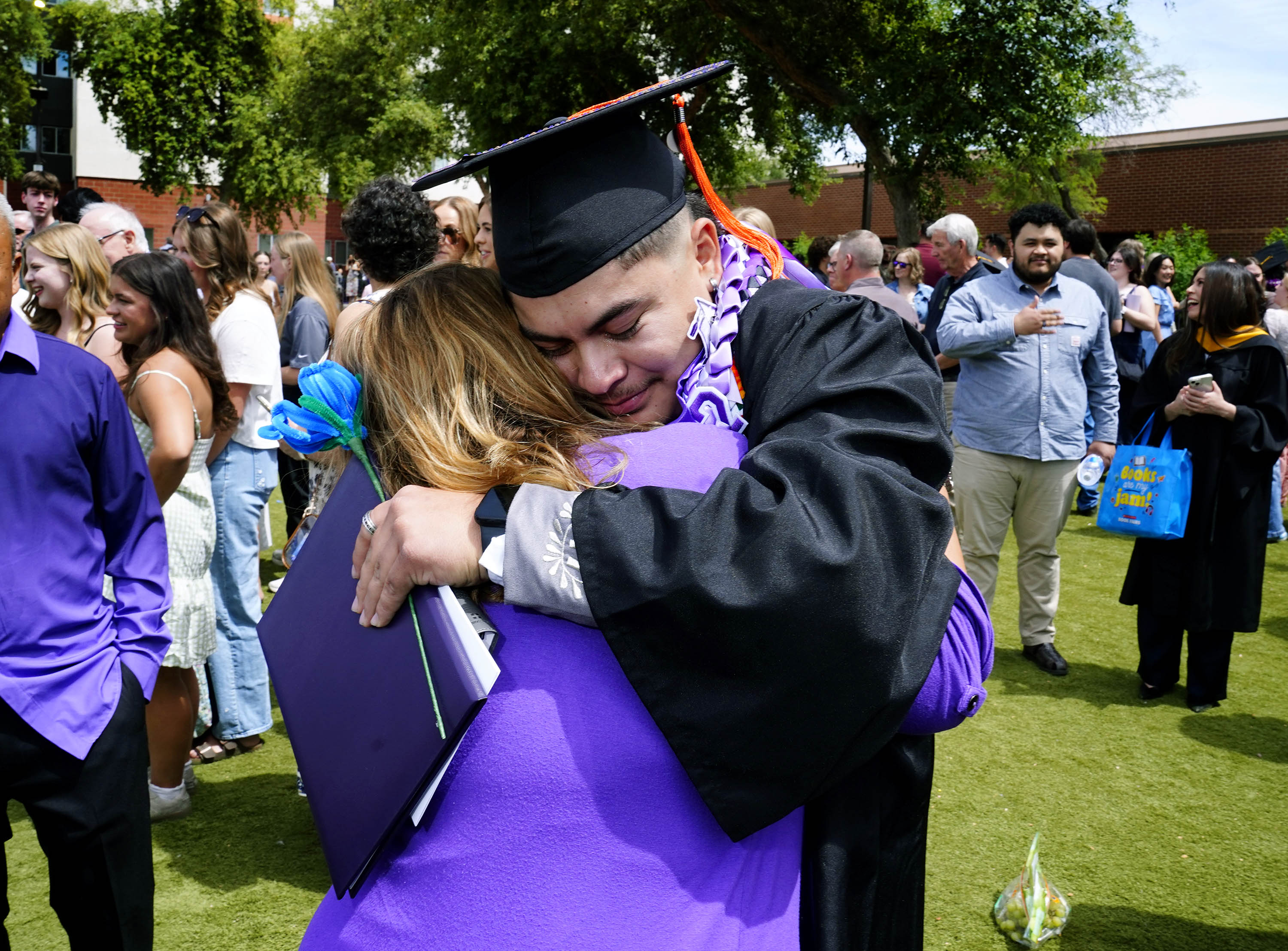 A graduate gets a hug from his mother on the Quad following the Thursday morning commencement ceremony at Global Credit Union Arena on April 23, 2026. -