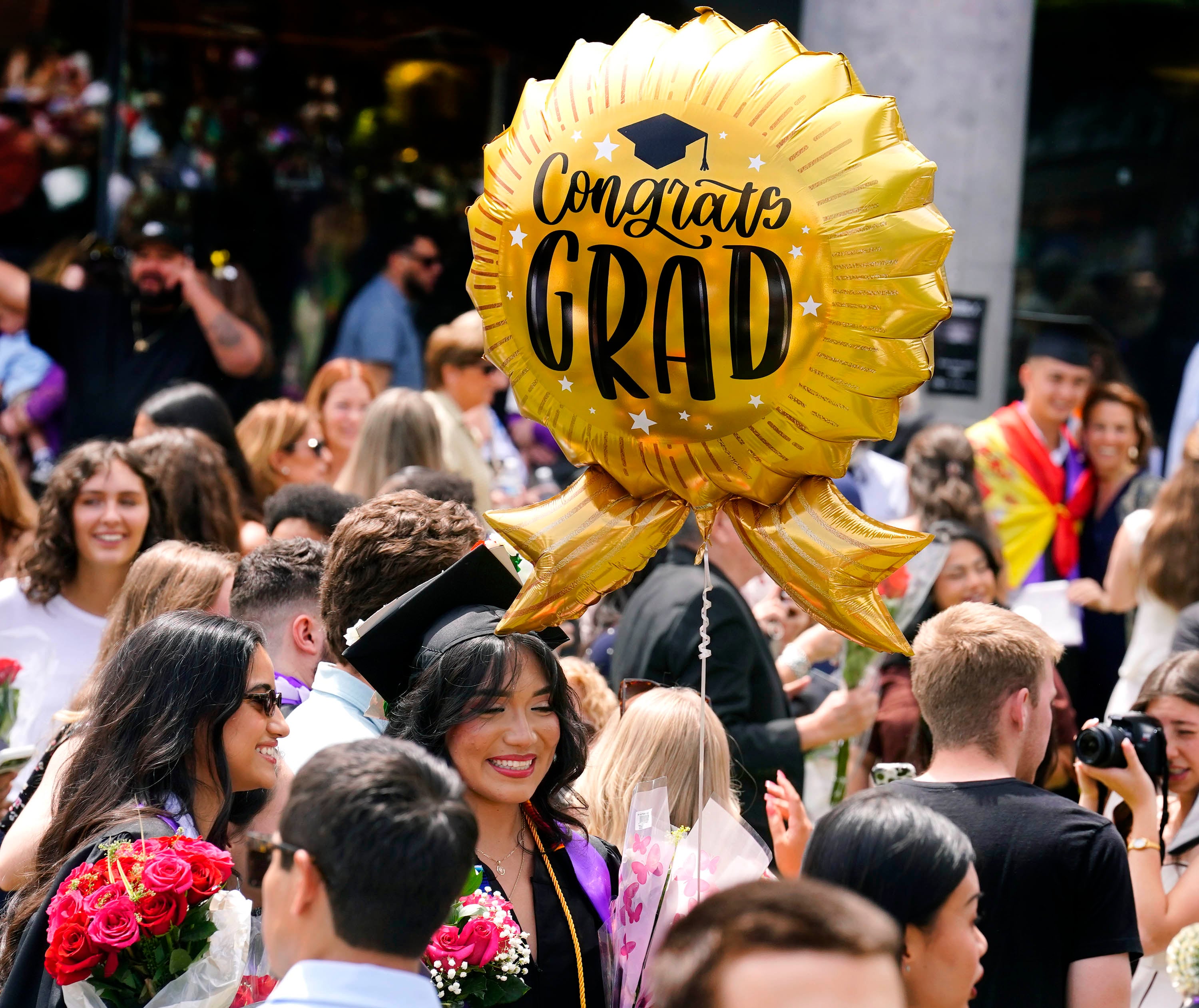 Graduates are greeted by friends and family members on the Quad following the Thursday morning commencement ceremony at Global Credit Union Arena on April 23, 2026. -