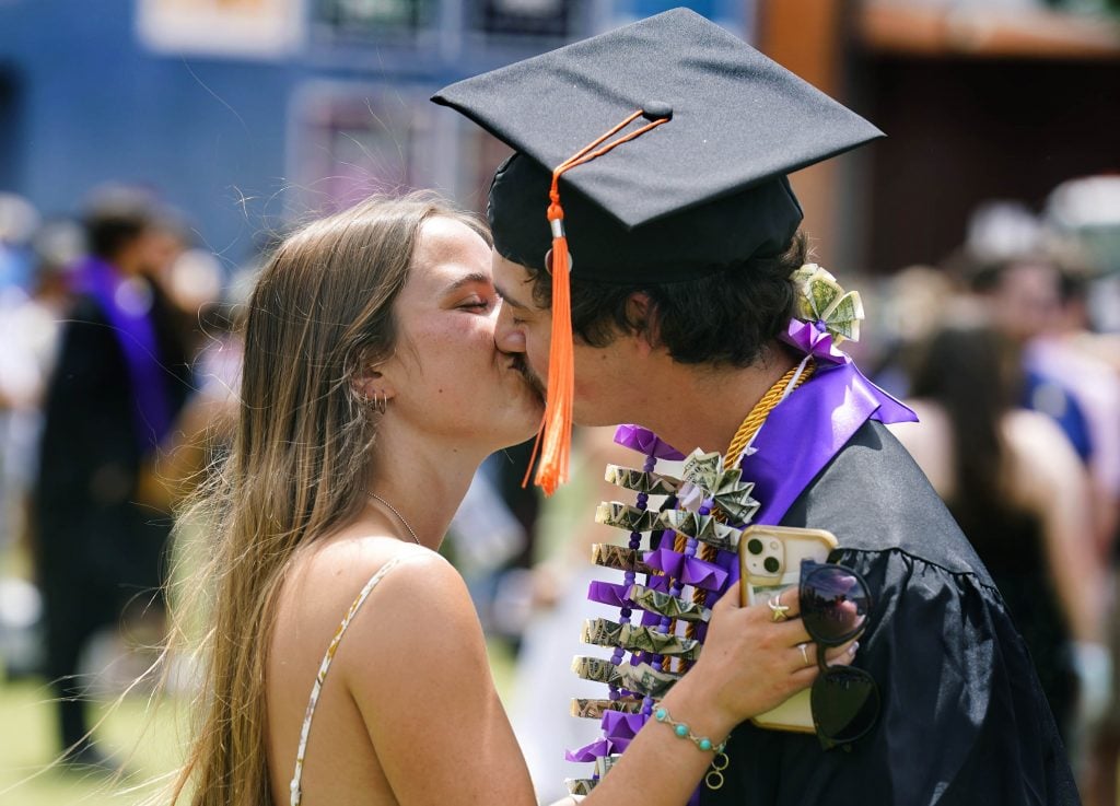 A graduate gets a congratulatory kiss from his girlfriend following the Thursday morning commencement ceremony at Global Credit Union Arena on April 23, 2026. -