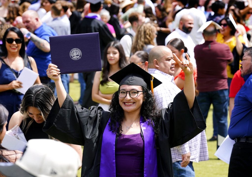 A graduate gives a Lopes Up as she shows off her diploma on the Quad following the Thursday morning commencement ceremony at Global Credit Union Arena on April 23, 2026. -